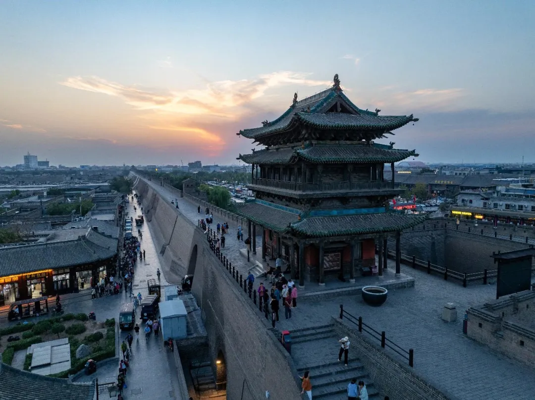 平遥标志,始建于西周、明洪武三年扩建,全长6.4公里,俯视形似“龟城”,3000个垛口、72座敌楼暗合儒家典故。
