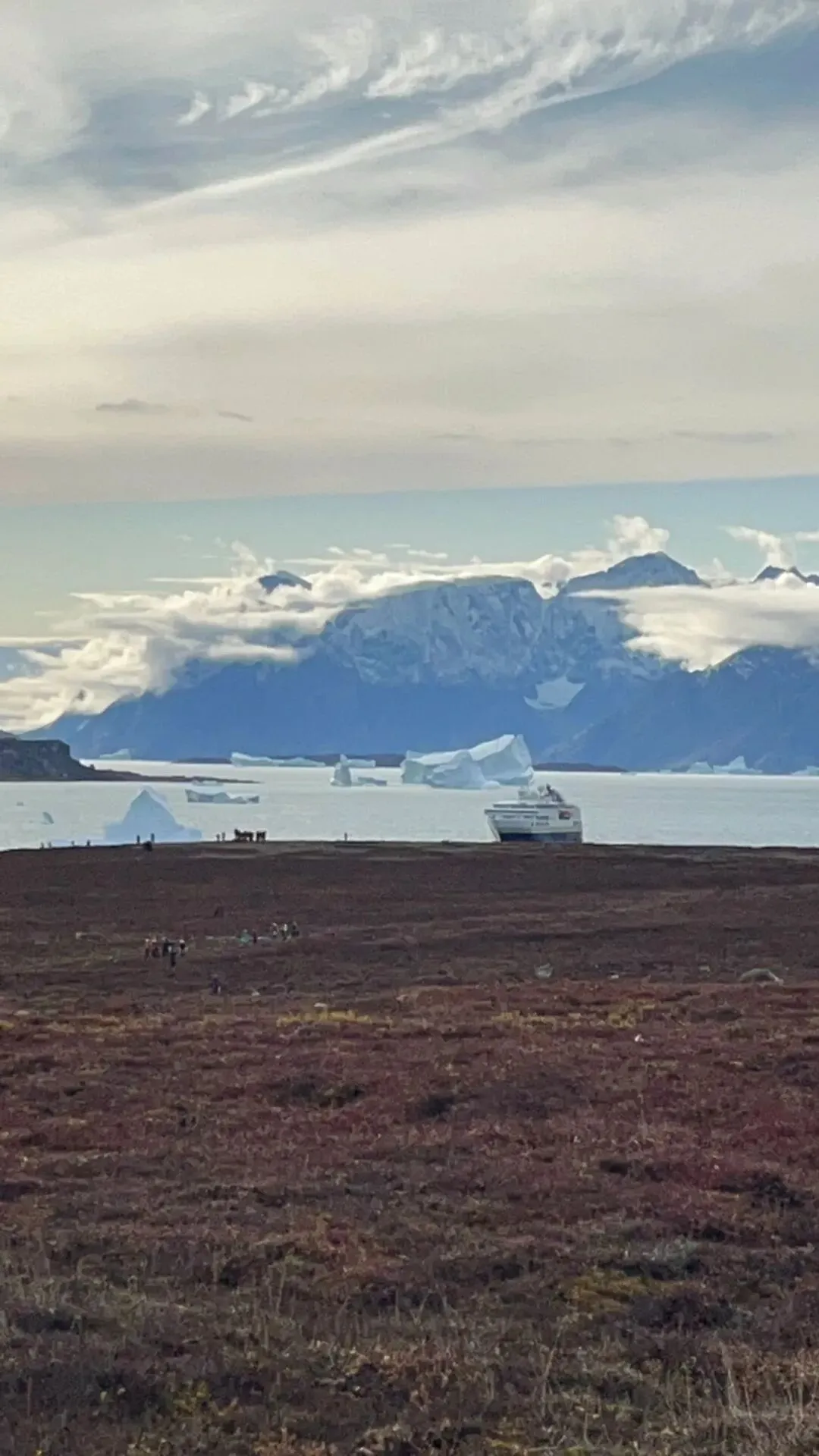 更特别的是,格陵兰段走的是东岸的斯科斯比湾——不是多数游客熟悉的西岸伊卢利萨特,而是人迹更稀少的另一面。世界上面积最大的峡湾,冰山漂在玄武岩裂谷间,没有邮轮,没有旅游中心,只有一个几十人的因纽特小镇。