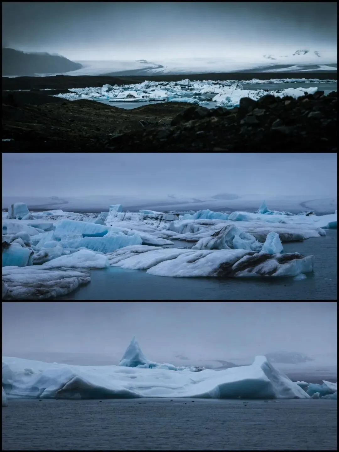 峡湾全长350公里,内部分支延伸超过500公里,是挪威松恩峡湾的20倍。水面上的冰山多是从峡湾源头的冰川直接崩落,没有经过长途漂流,棱角更锋利,颜色更纯粹。玄武岩峭壁是红褐色的,与蓝白色的冰山形成强烈反差,这个色彩组合在西海岸看不到。