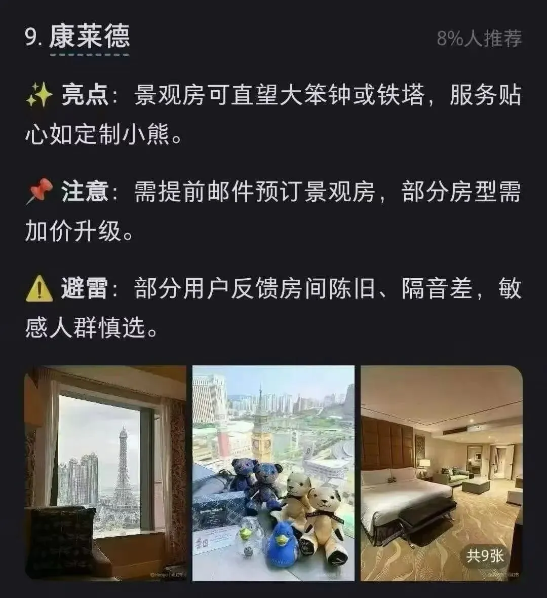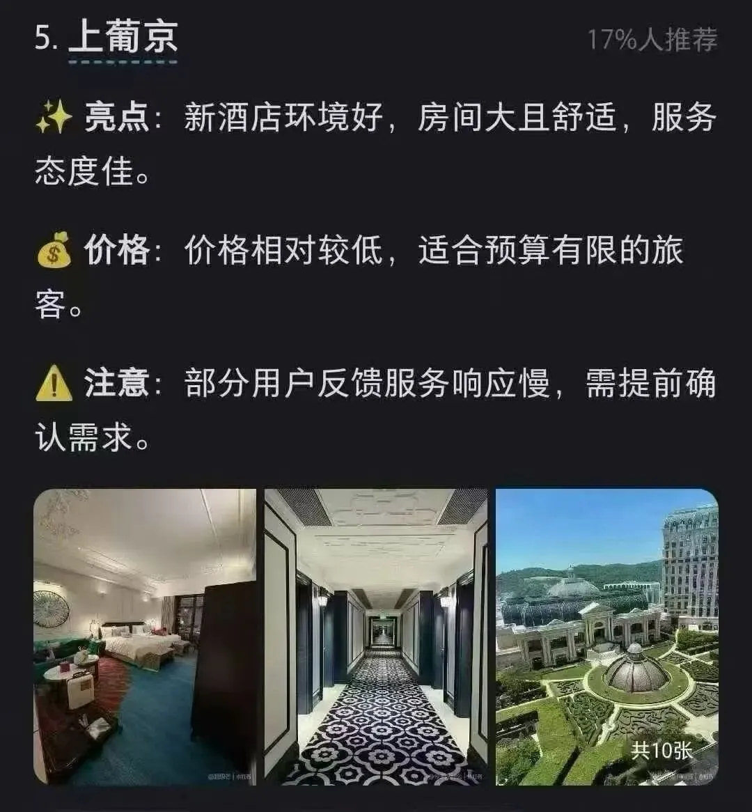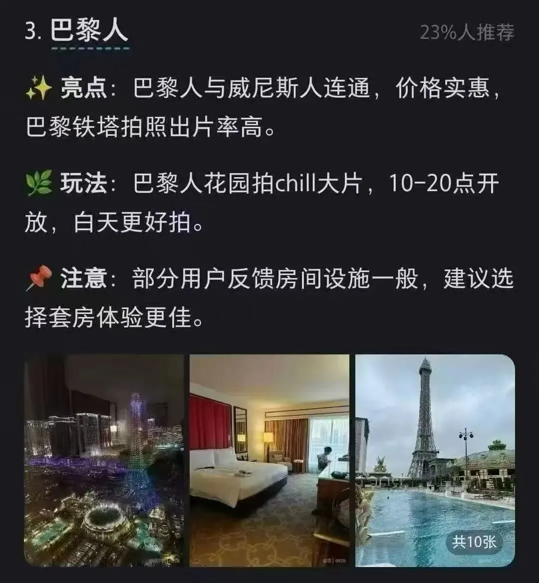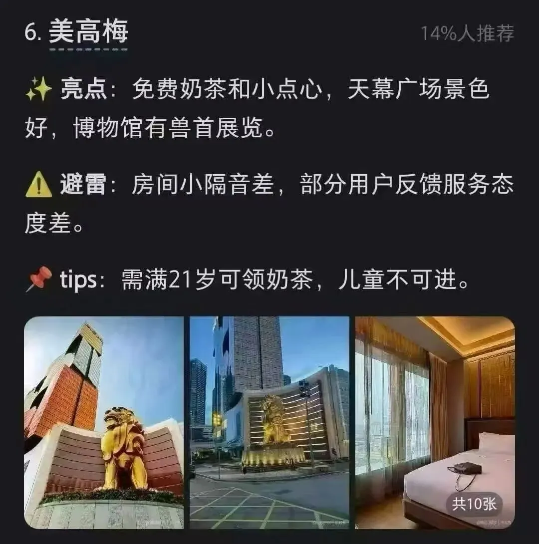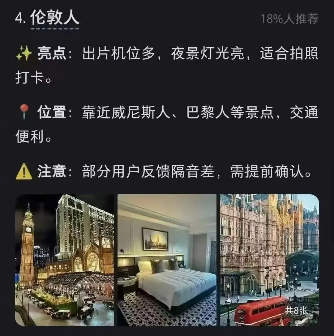 您现在的位置是:首页 > 国内旅游目的推荐 > 正文 国内旅游目的推荐 澳门旅游攻略之氹仔新区酒店 admin2026年04月20日 15:49:20国内旅游目的推荐1 澳门旅游攻略之氹仔新区酒店各大酒店亮点及利弊介绍 转载请说明来源于"旅荐网",部分内容转载自网络,如有侵权请联系qlwl@foxmail.com删除 本文地址:https://www.15386.cn/post/156656.html 上一篇 斯瓦尔巴+西格陵兰+冰岛18天旅行攻略,附每日行程复盘 下一篇 2026暑假邮轮旅行攻略 | 带娃躺平就选它! 相关文章 广西5天4晚旅游攻略|第一次去就看这份吧 苏杭4天3晚旅游攻略!乌镇+西湖+苏州园林,照着走不踩雷 2026暑假邮轮旅行攻略 | 带娃躺平就选它! 斯瓦尔巴+西格陵兰+冰岛18天旅行攻略,附每日行程复盘 般若舟祈福问道崆峒山旅游攻略蒲公英 男朋友做的长沙旅游攻略已经next level了 歙县五一旅游攻略抢先看!这座皖美宝藏小城,带你梦回千年徽州! 五一旅游方案推荐 五一聊城旅游攻略:邂逅江北水城,慢享运河古韵 北京旅游4-5月旅游攻略,5天4晚行程! 发表评论 取消回复 评论列表 这篇文章还没有收到评论,赶紧来抢沙发吧~