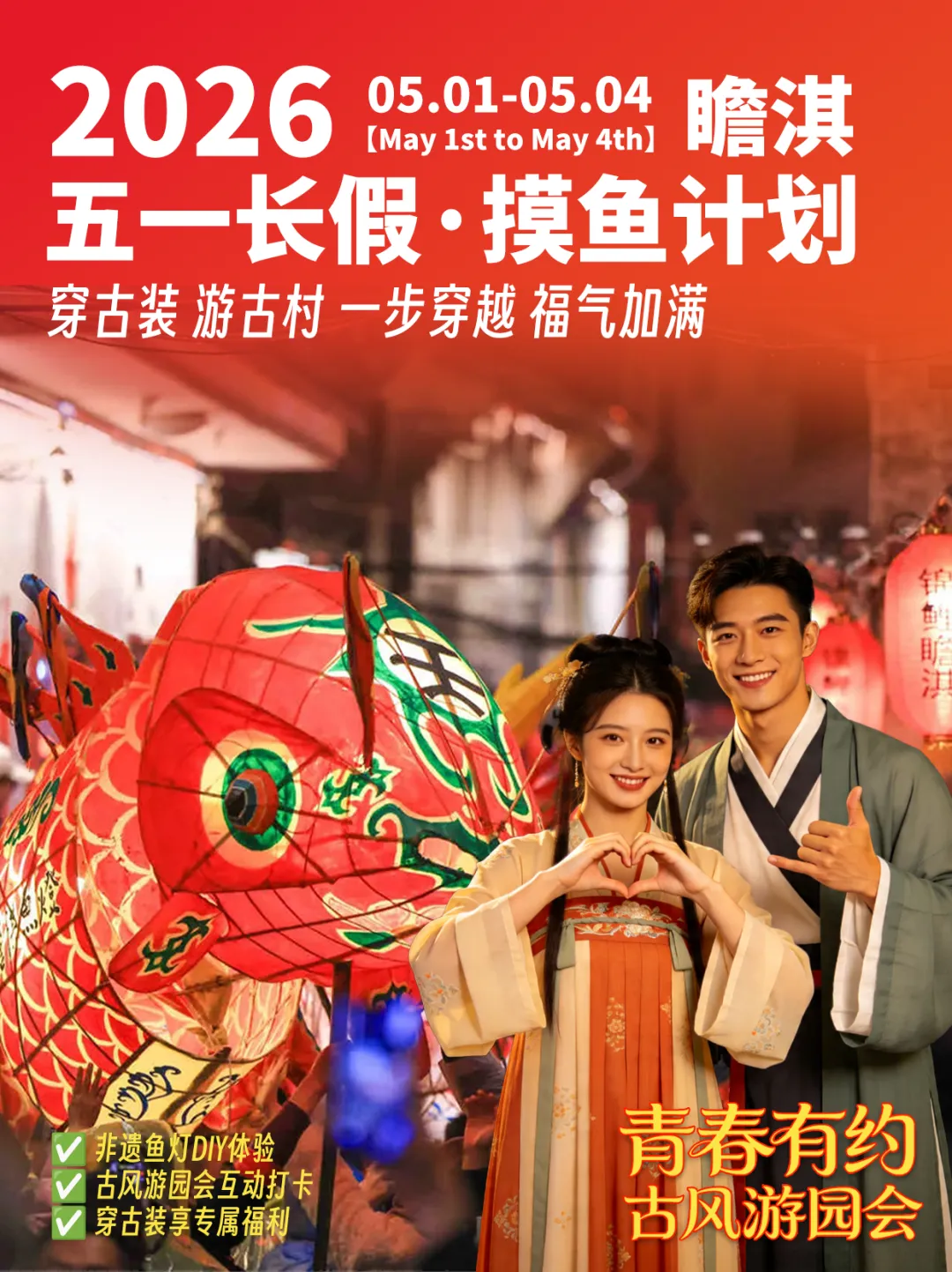 2026年5月1日-4日,瞻淇村“青春有约”古风游园会启幕,非遗鱼灯 DIY、沉浸式古风打卡、专属福利活动同步上线。