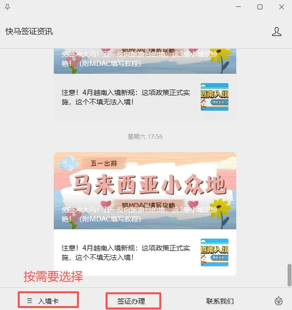 公众号底部菜单栏选择入境卡/签证