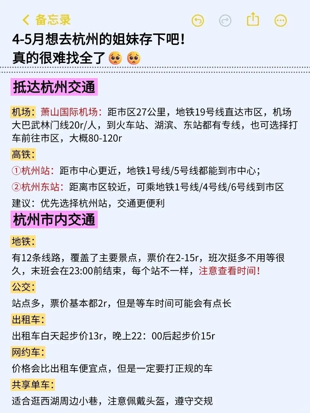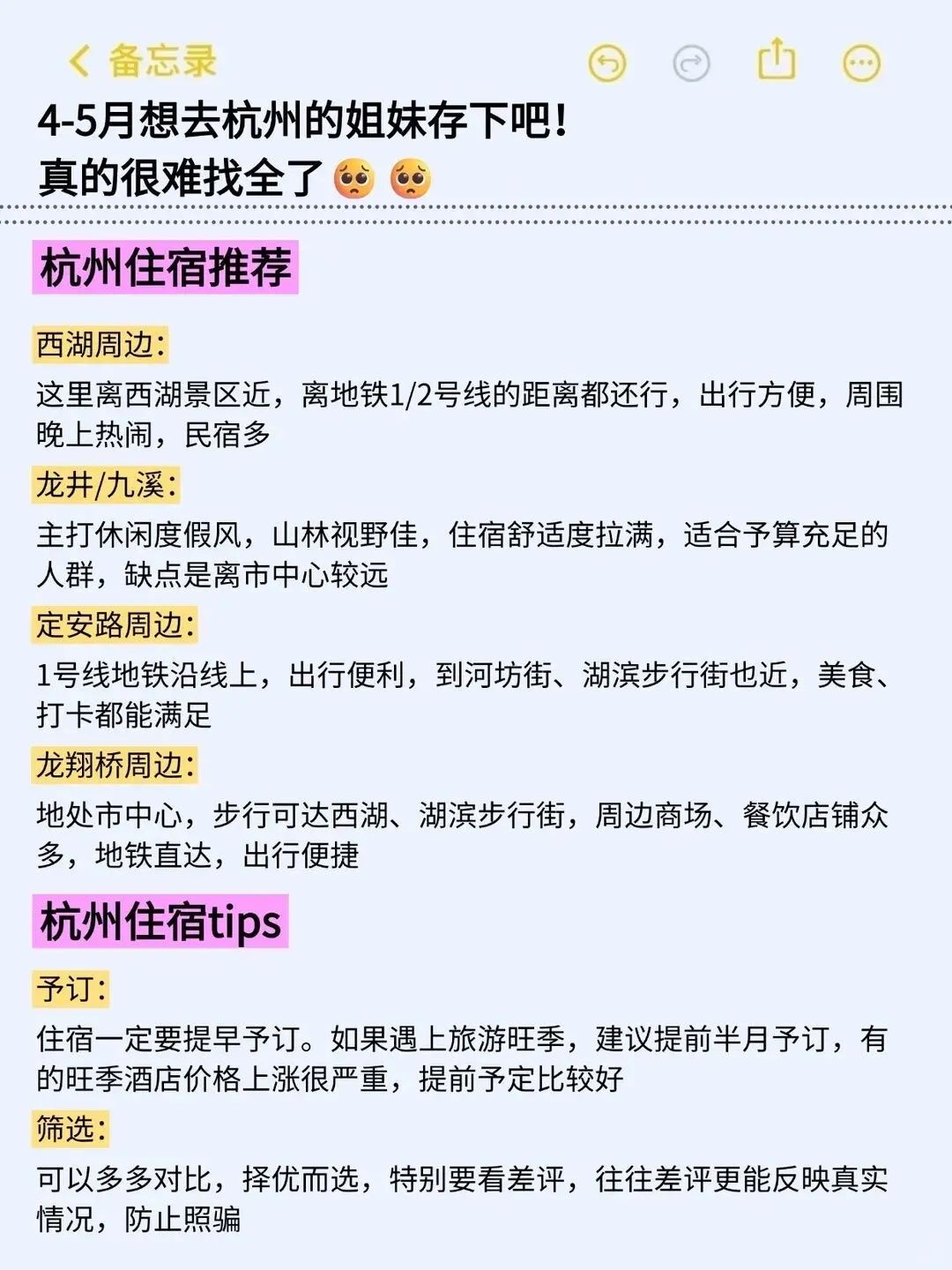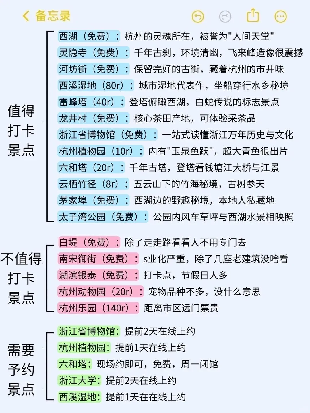 小贴士:4月5月是杭州的小淡季春色最美人相对少体验感超棒,但杭州春天多雨出门一定要带伞晴雨两用最实用,景区周边买丝绸茶叶藕粉别冲动多看多比价,灵隐寺一定要早上去避开旅行团人流体验更清净,浙江省博物馆免费参观但需提前预约周一闭馆,吃小吃可以去武林夜市河坊街老巷弄里种类多价格实惠,西湖游船建议从断桥或花港观鱼上船选摇橹船更有感觉记得砍价别被坑,去九溪烟树不要穿拖地裤或者超长裙溪边附近会有些泥泞容易沾染上,龙井村买茶不急的话可以下午4:30之后去价格比白天要划算很多能省则省。
