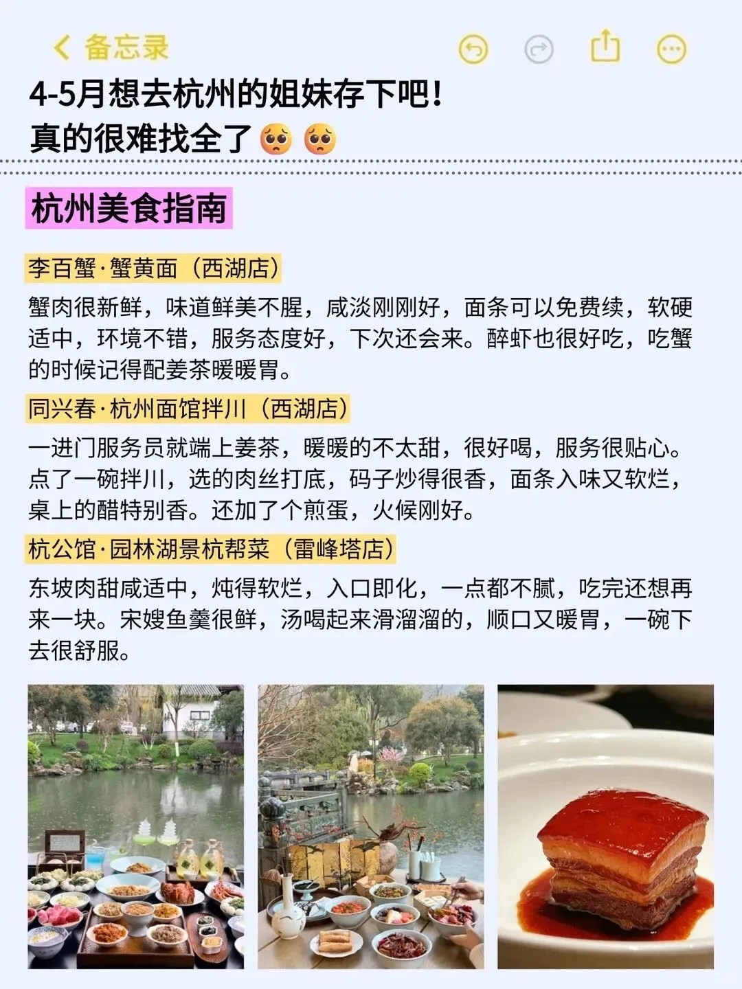 如果你非要选几家店,李百蟹的蟹肉很新鲜味道鲜美不腥,面条可以免费续软硬适中,杭公馆的东坡肉甜咸适中炖得软烂入口即化一点都不腻,这些细节才是决定你满意度的关键,因为你在别的地方也能吃到肉和面,但只有在杭州你才能吃到这种刚刚好的味道,那种不紧不慢的烹饪节奏。