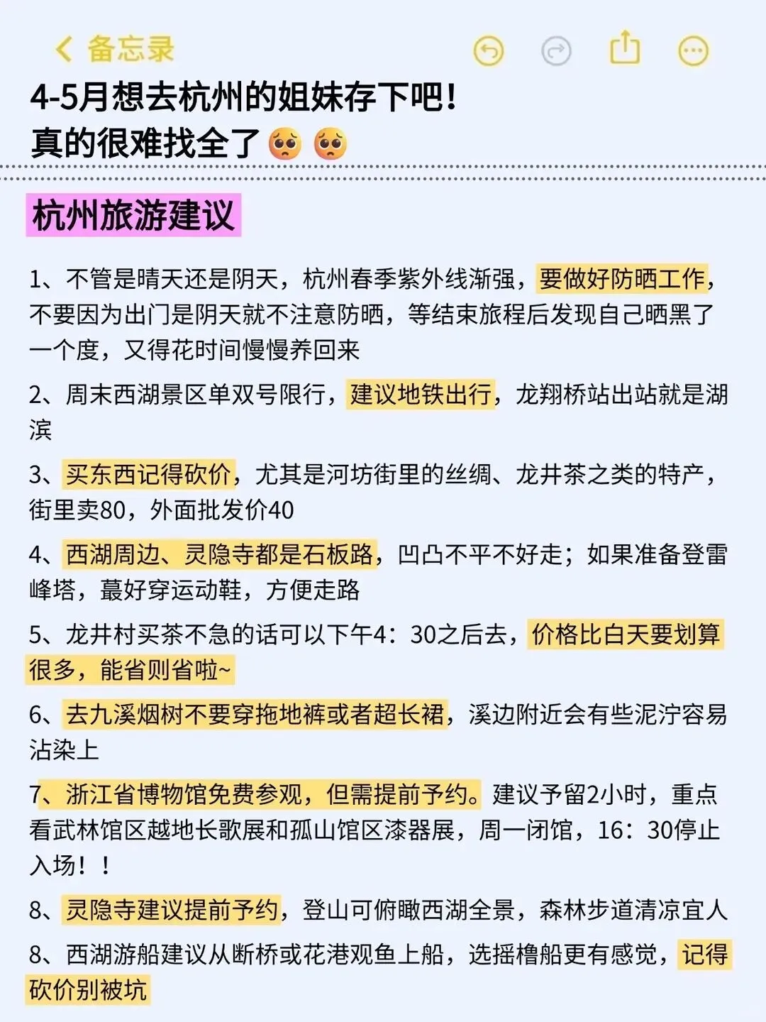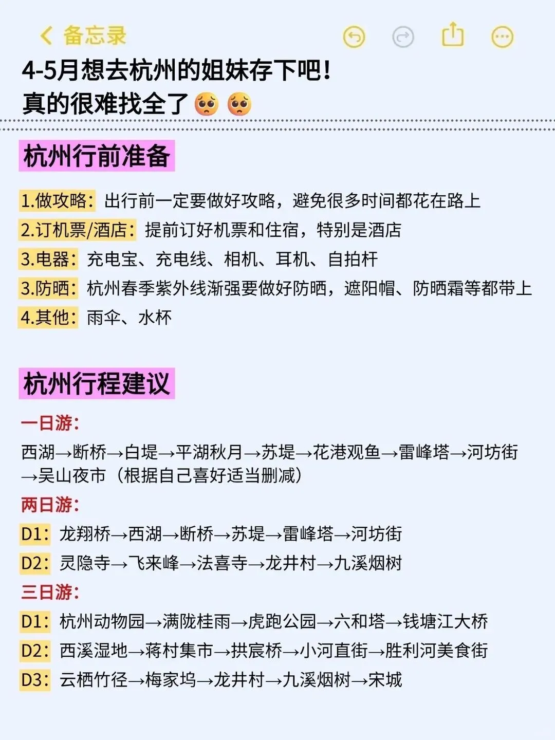 出行前一定要做好攻略避免很多时间都花在路上,电器防晒雨伞水杯这些都要带上,杭州春季紫外线渐强要做好防晒工作,不要因为出门是阴天就不注意防晒,等结束旅程后发现自己晒黑了一个度又得花时间慢慢养回来,这种对身体的照顾也是旅行的一部分。