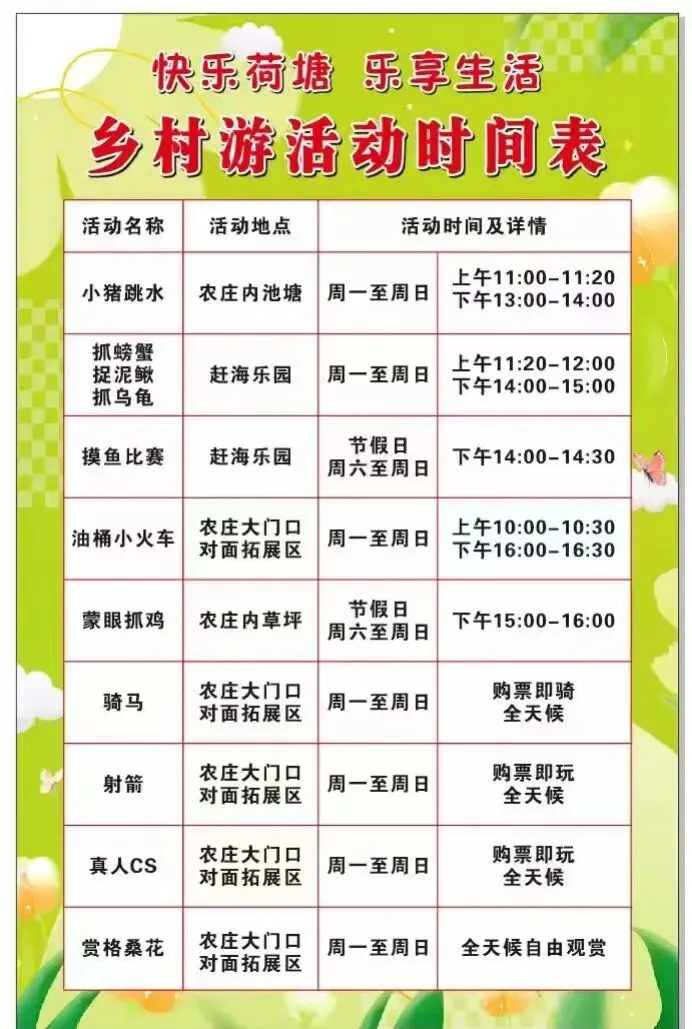 上午8:30-10:30亲子游园会:赏格桑花,喂山羊、吊环桥挑战、荡秋千、手摇船、蹦蹦云、海盗船、龟兔赛跑、大摆锤、地球仪、摇摇马、火山攀岩等趣味游乐设施,射箭、网红小火车,老人可在户外休闲区品茶,欣赏乡村风景,农庄也提供室内休息室,麻将房,K歌,乒乓球等