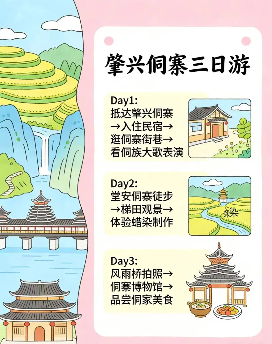 Day1:抵达肇兴侗寨→入住民宿→逛侗寨街巷→看侗族大歌表演