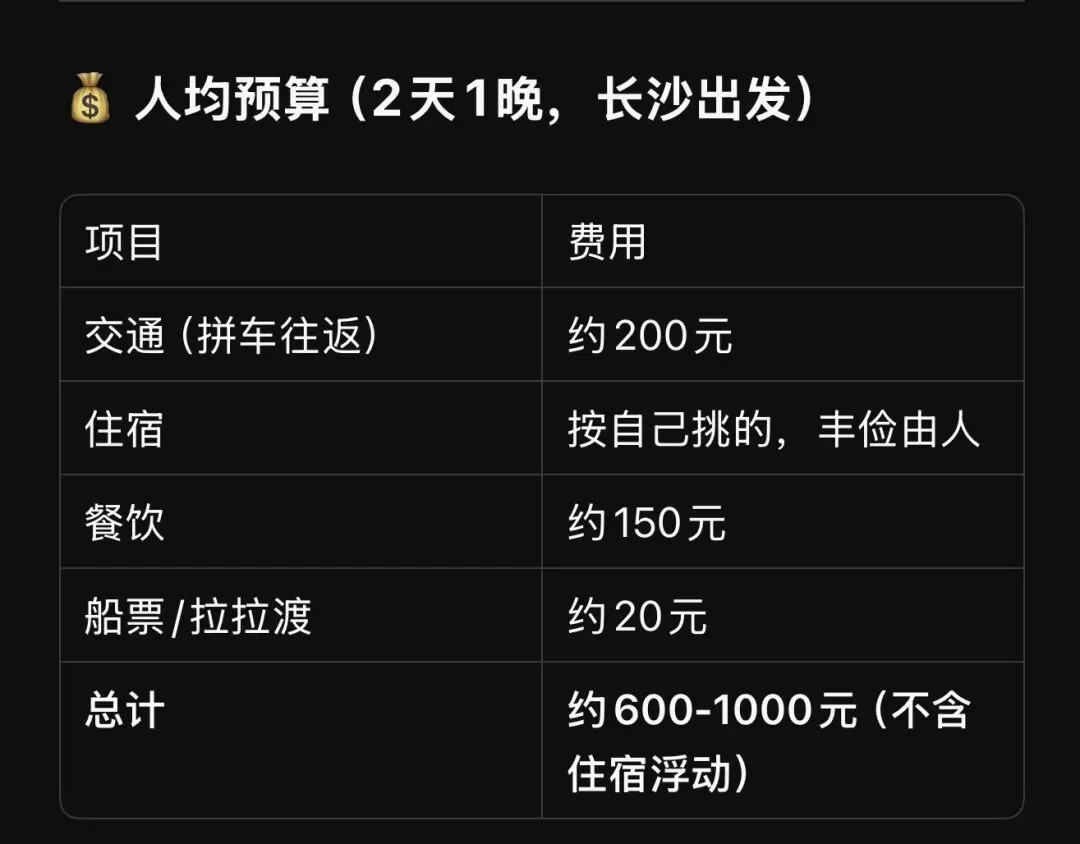 💰 人均预算(2天1晚,长沙出发),