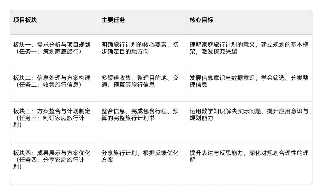 本项目源自北师大版三年级下册“综合与实践”领域内容,以“家庭旅行计划”这一真实生活情境为载体,打破学科壁垒,引导学生将数学中的数据收集、计算、规划能力,与生活实际需求结合,解决真实问题。学生通过完整经历“策划-收集信息-制定计划-分享优化”的实践流程,体会数学的实用性,同时培养家庭责任感、合作沟通能力与规划意识。