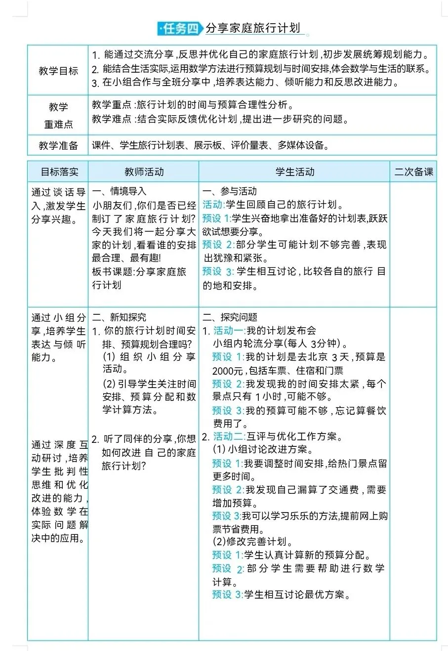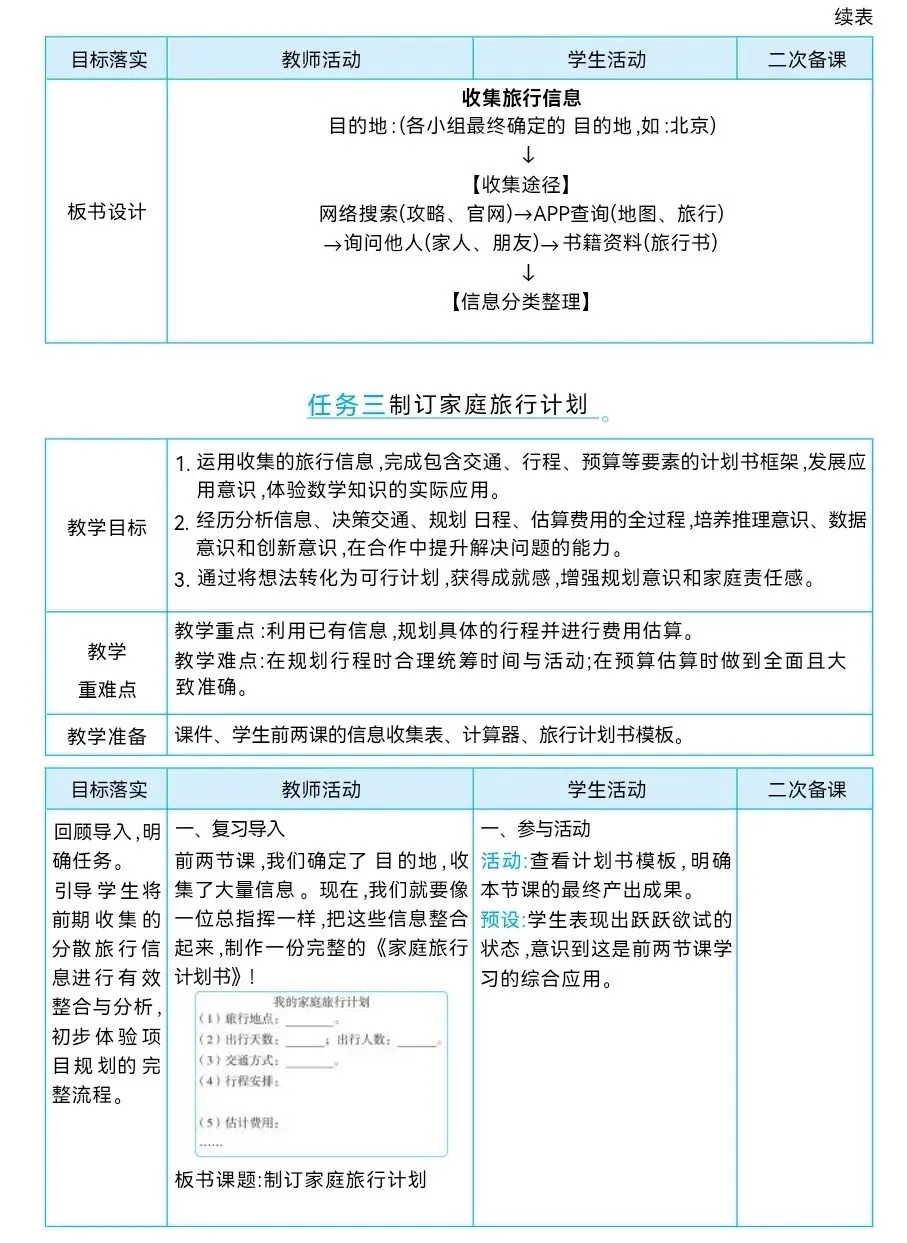 3. 能运用数学方法完成旅行预算规划、日程安排,制定一份完整可行的家庭旅行计划书。