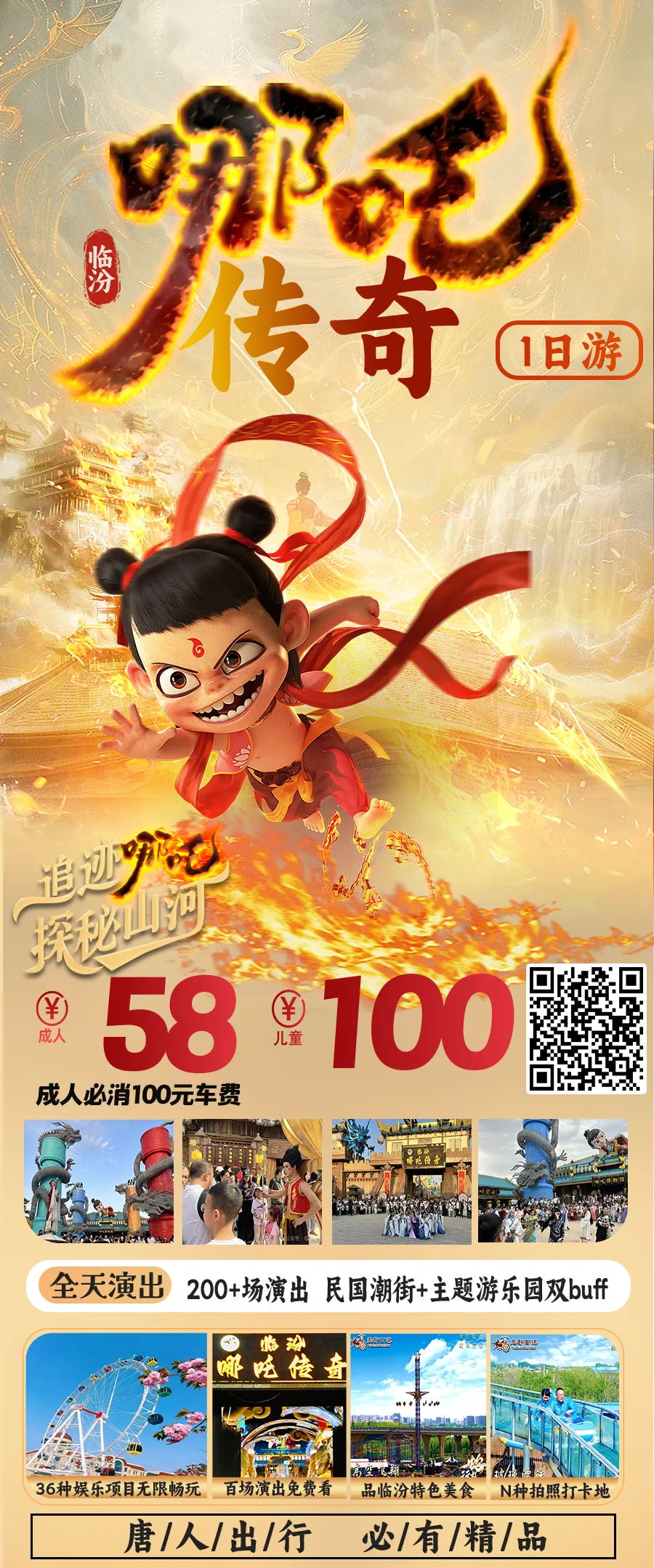❹🎢临汾哪吒传奇景区1日游💰成人:58元/人💰儿童:100元/人⏰团期:4月25日