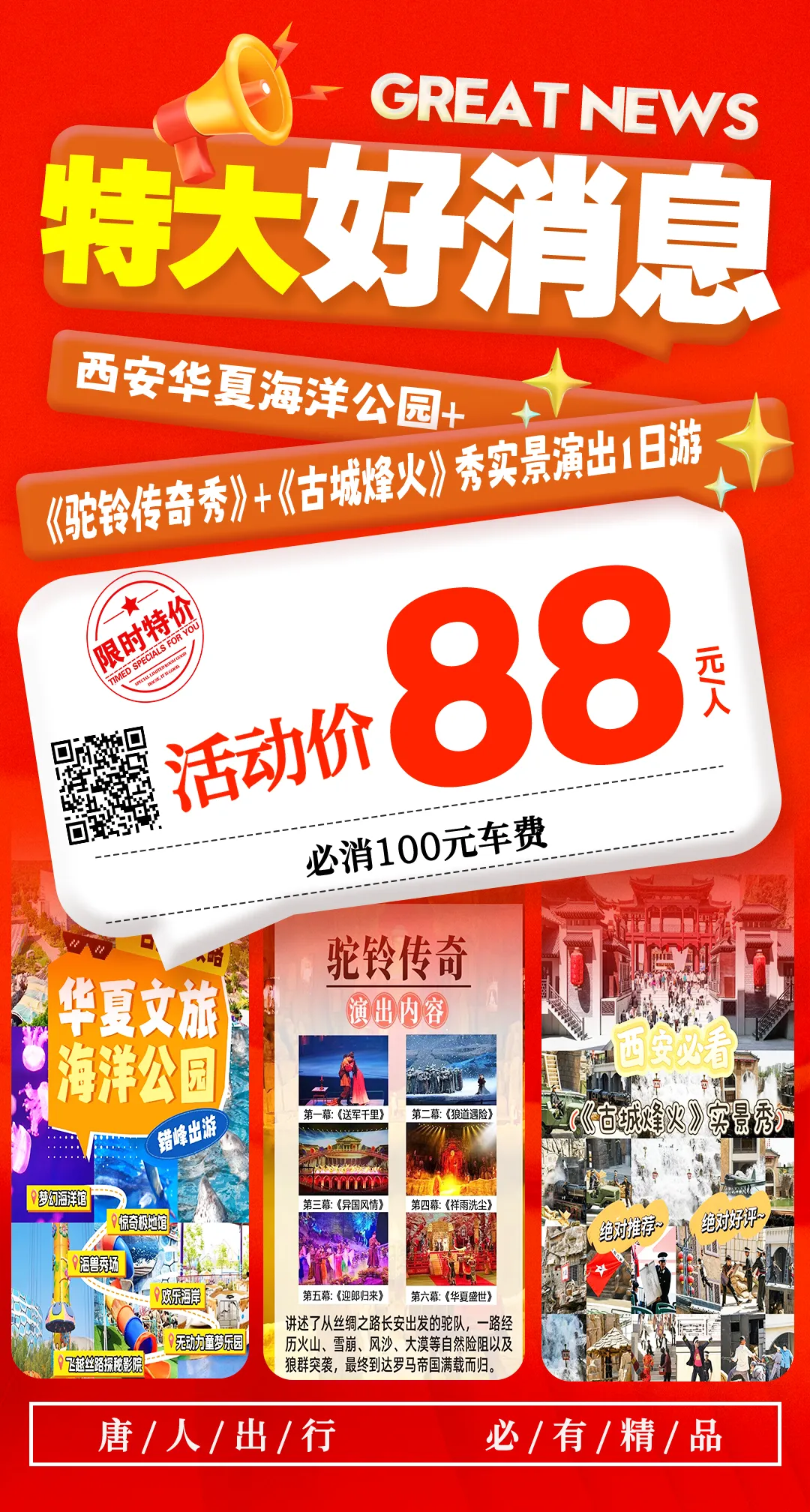🎄【西安2大王牌演出】华夏文旅海洋公园+驼铃传奇秀+《古城烽火》1日游💰成人:88元/人💰儿童:100元/人⏰团期:4月25日(特价最后一期)