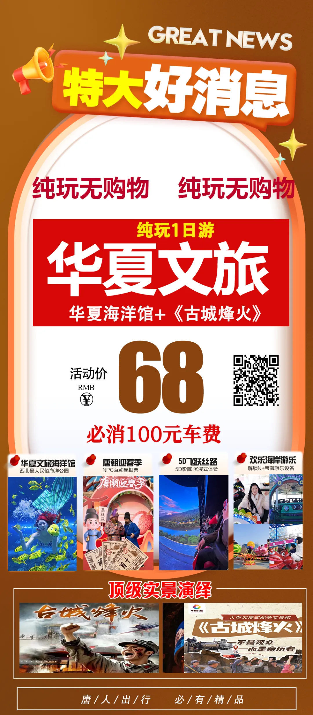❽🔥西安新演出 太震撼了🚀华夏文旅海洋馆➕《古城烽火》1日游💰成人:68元/人💰儿童:100元/人⏰团期:4月25日(特价最后一期)