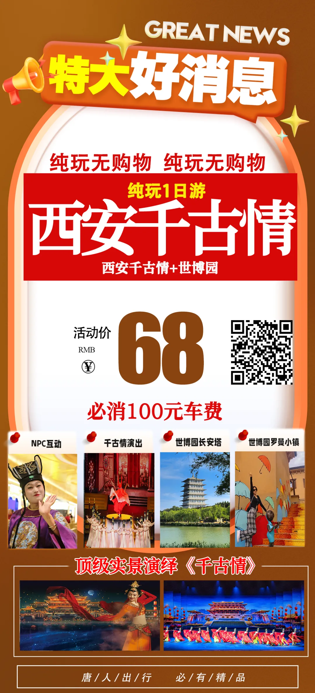 ❾🫧西安千古情1日游💰成人:68元/人💰儿童:100元/人⏰团期:4月25日(特价最后一期)