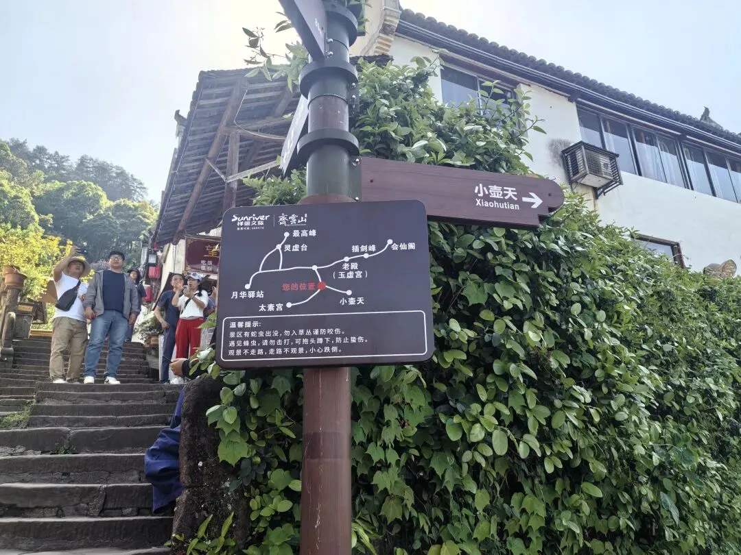 游客中心 → 景交 → 索道上山 → 望仙楼 → 寿字岩 → 真仙洞府(摩崖石刻)→ 月华天街(午餐)→ 太素宫 → 玉虚宫(唐伯虎碑)→ 徒步下山 → 齐云小镇