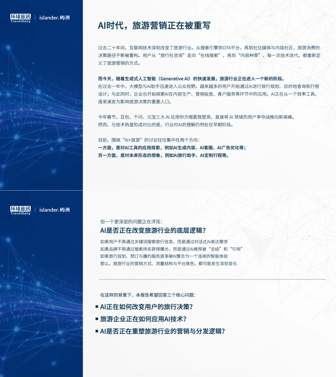 随着生成式人工智能(GenerativeAI)的快速发展,#旅游行业 正在进入一个新的阶段。在过去一年中,大模型与A助手迅速进入公众视野。越来越多的用户开始通过AI进行旅行规划、目的地查询和行程设计;与此同时,企业也开始探索AI在内容生产、营销投放、客户服务等环节中的应用。AI正在从一个效率工具,逐渐演变为影响旅游决策的重要入口。