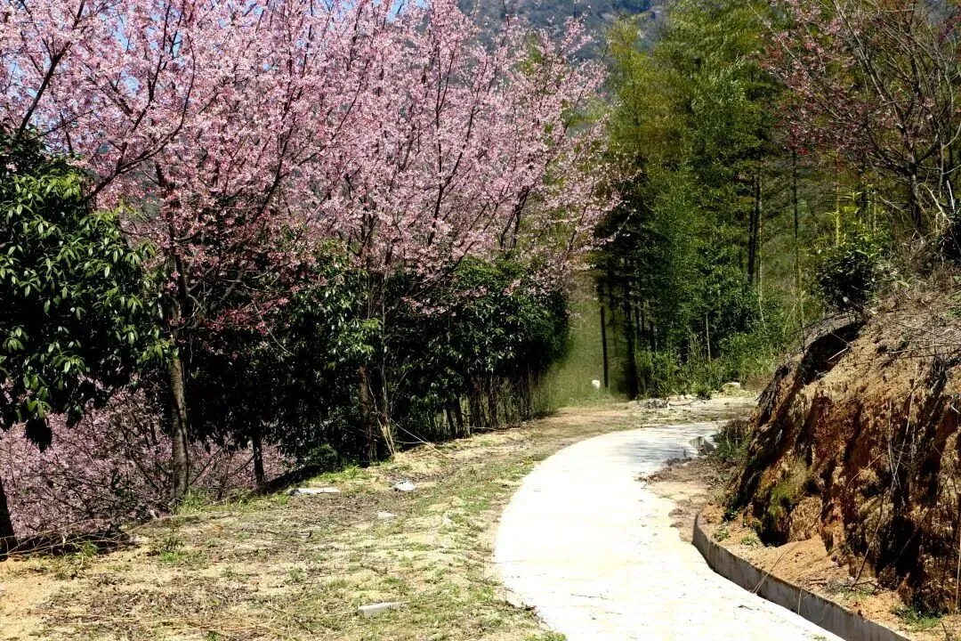 艳红花朵与青山翠竹相映