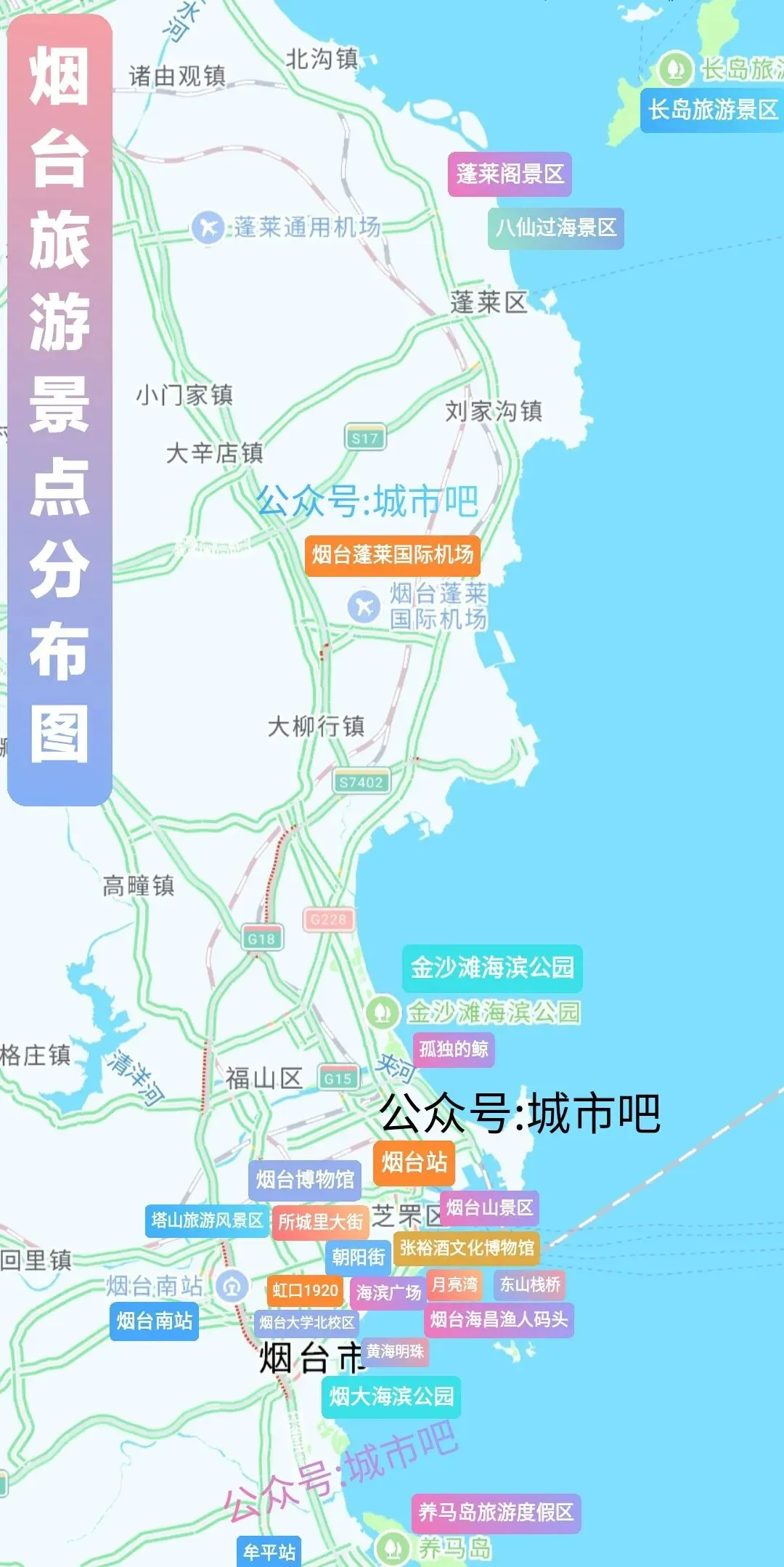 高铁:抵烟台站,出站乘17路“网红海上巴士”(二层左侧观海座)至烟台山(30分钟,1元)