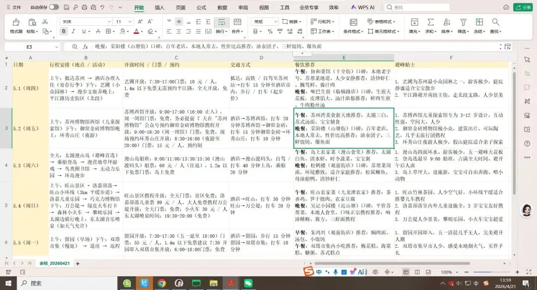 *行程规划:确定每天的旅行地点、住宿地点和活动安排,根据目的地的地理位置,规划合理的路线,尽量缩短交通时间,避免不必要的往返--提醒每个景点的开放时间,门票价格和是否需要提前预订