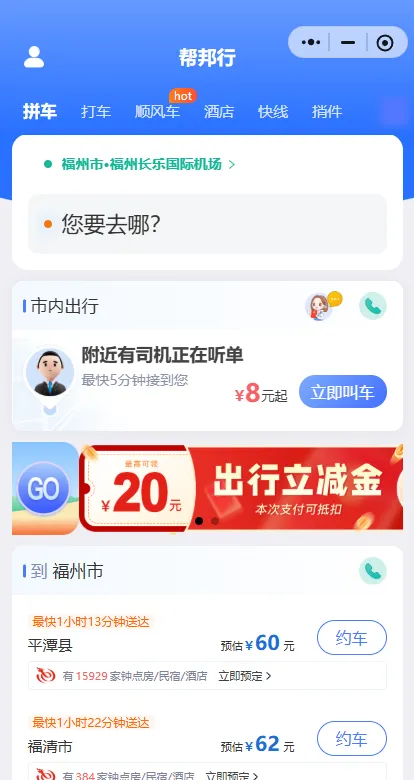 离平潭最近的机场——福州长乐机场,落地后车程仅1小时左右,省时又高效~微信小程序“帮邦行”可直接预约车辆,来回接送,不用费心找车,轻松直达平潭!