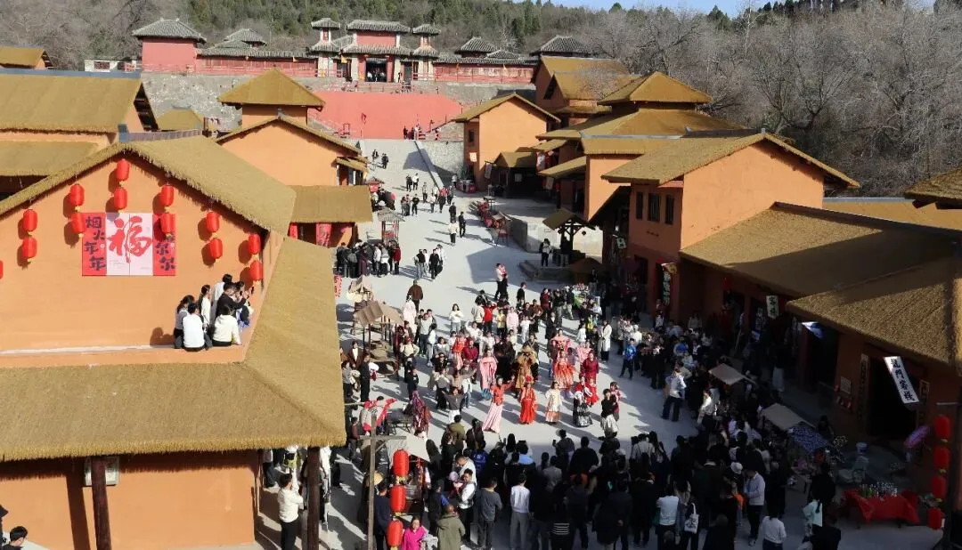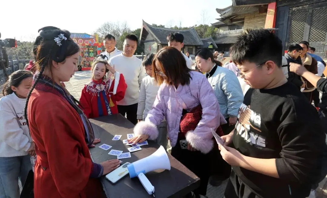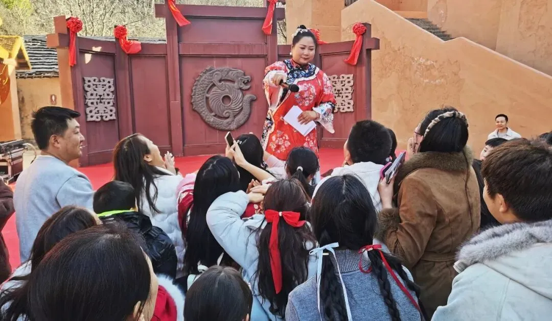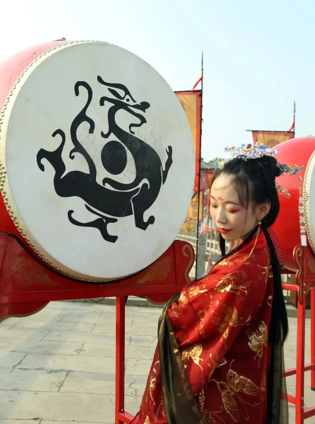 在景区城门外广场,威风锣鼓,列队迎宾,搭配传统民俗表演,营造热烈喜庆的节日氛围,喜迎贵宾入城。