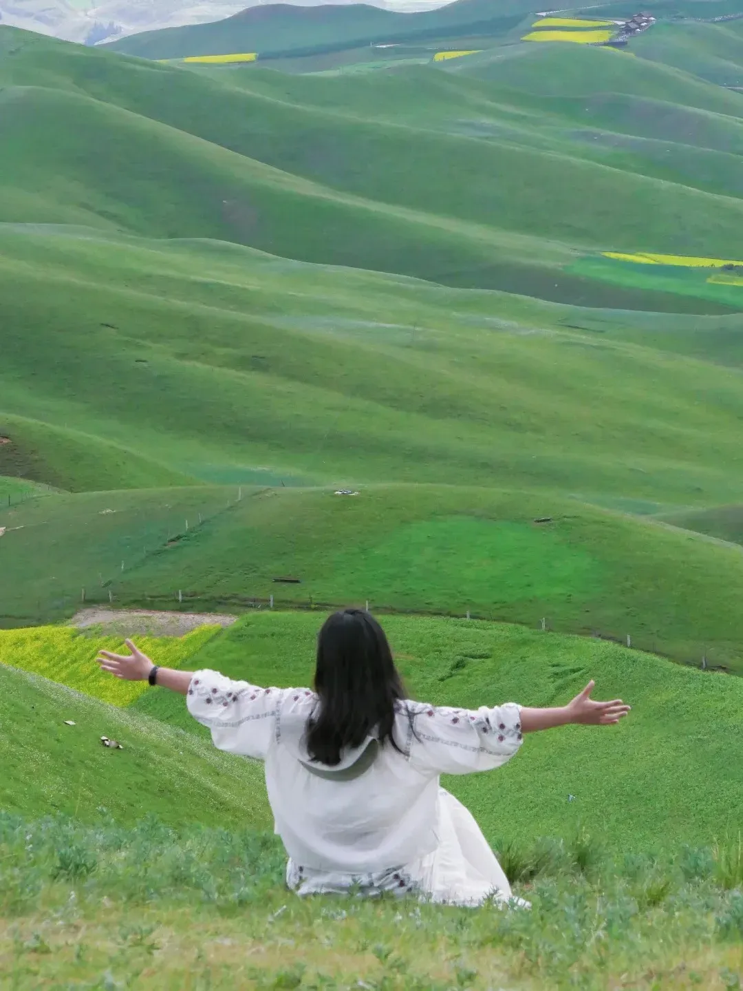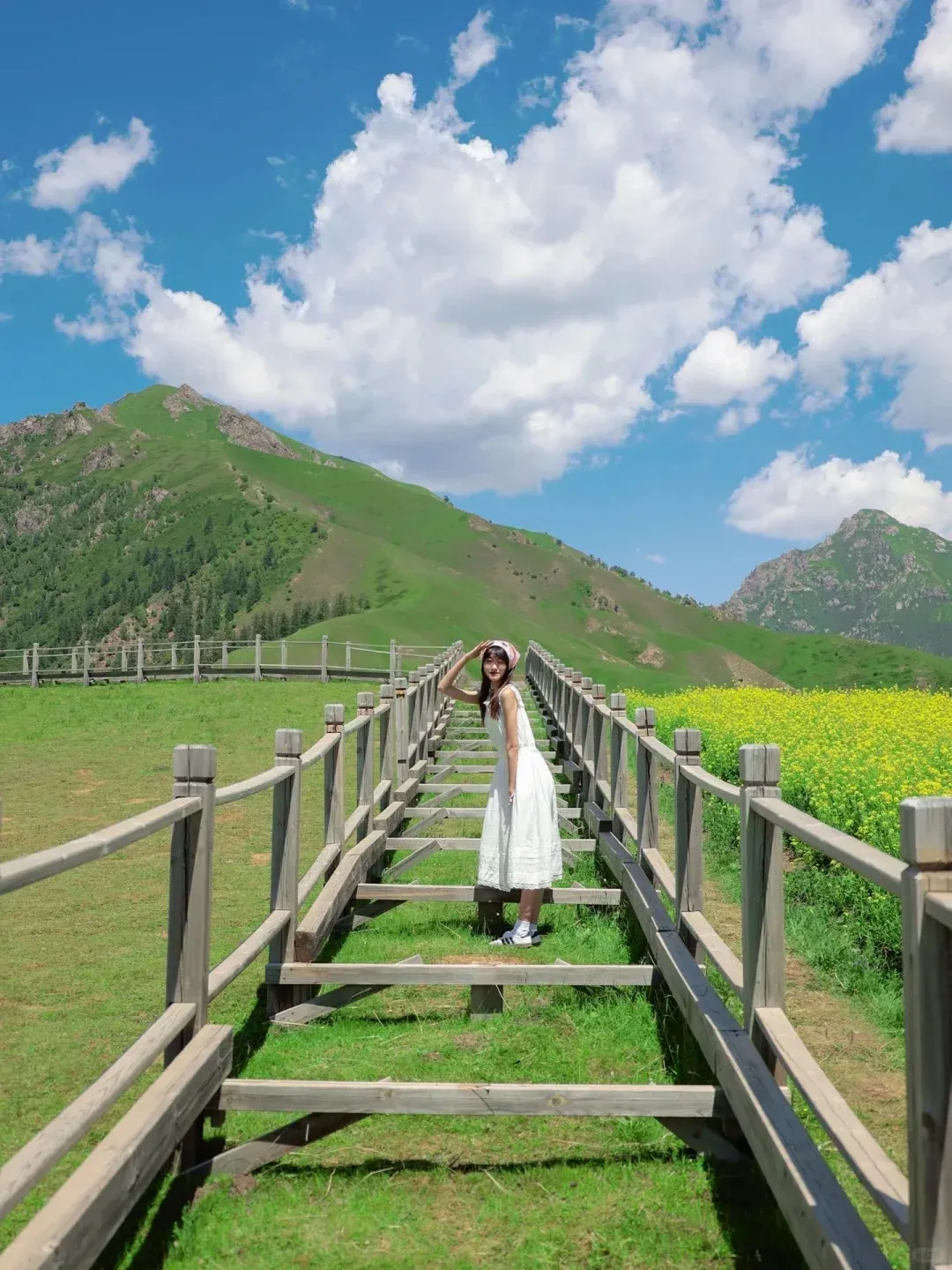 划重点:田园风一定要在田间拍摄才会有感觉,白色或亮黄是不错的选择,而淡雅文艺的碎花裙在草原也可以很清新。