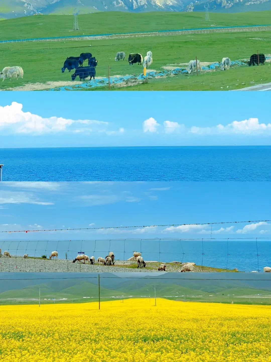 湛蓝的青海湖闪烁波光,金黄的油菜花迎风怒放,洁白的盐湖映衬着蓝天白云,碧蓝的翡翠湖在雪山下流淌…