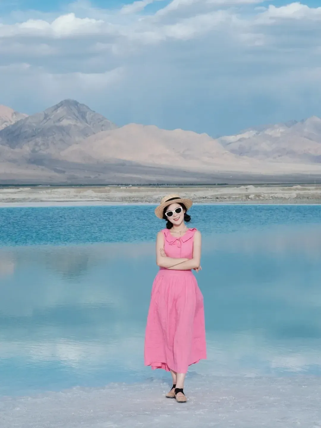 划重点:清新纯粹的湖泊更适合款式简单、颜色干净的衣服。比起裤装,湖泊似乎更适合长裙,一袭白色长裙亭亭玉立在蓝色的湖水,仿佛踏水而来。