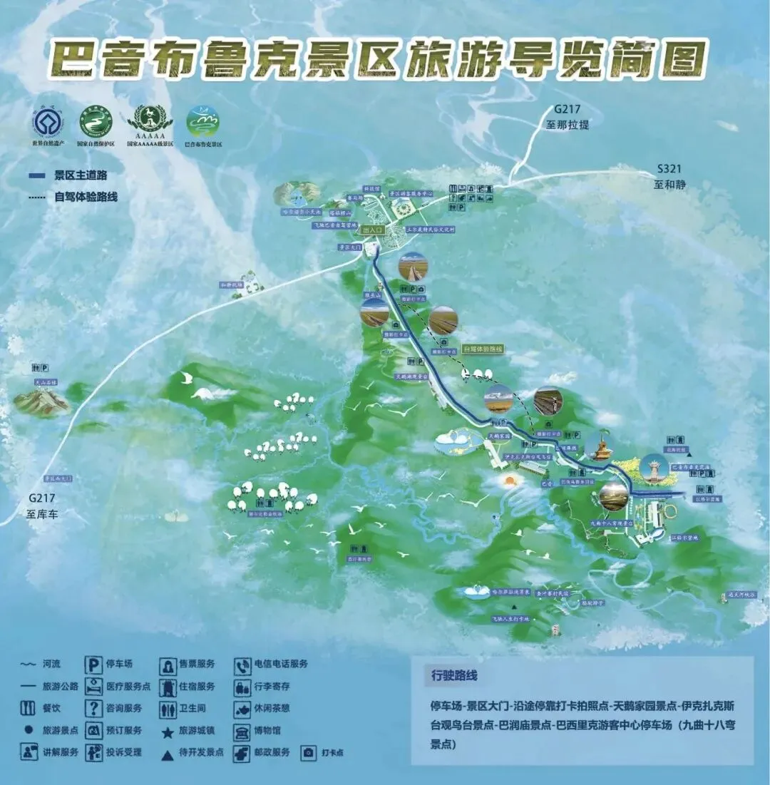 游客服务中心→天鹅湖观景台(沿途赏景)→天鹅家园→伊克扎克斯台观鸟台→巴西里克服务中心(栈道步行/观光车/骑马)→九曲十八弯/同心岛。