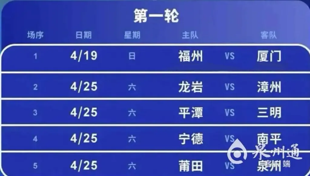本次闽超联赛第一轮,于4月19日(本周日)福州(主队)VS 厦门(客队)打响揭幕战,其余4场焦点对决全部定档4月25日(星期六),具体对阵如下: