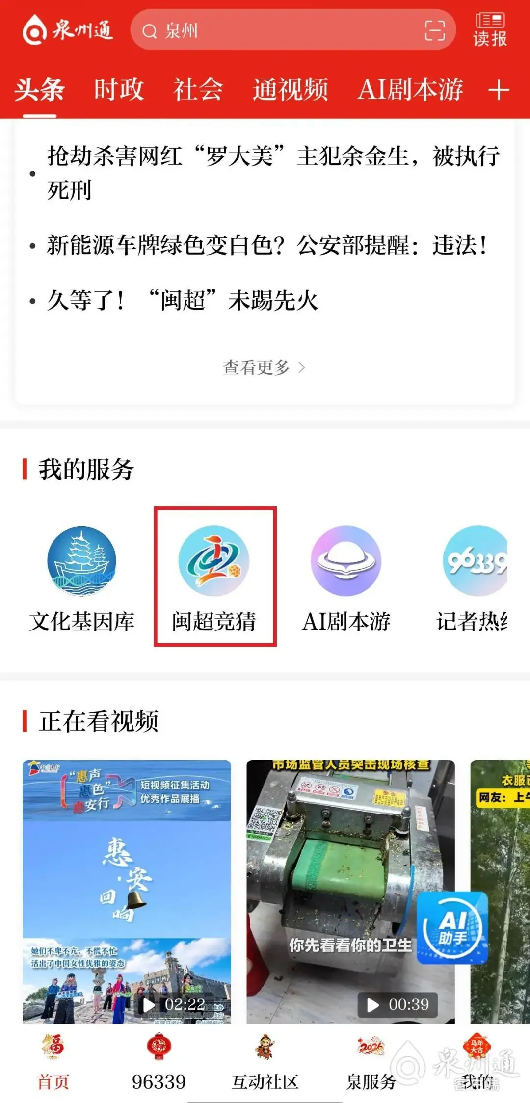 打开泉州通客户端,点击首页头条「我的服务」—「闽超竞猜」,即可进入专属互动专区:
