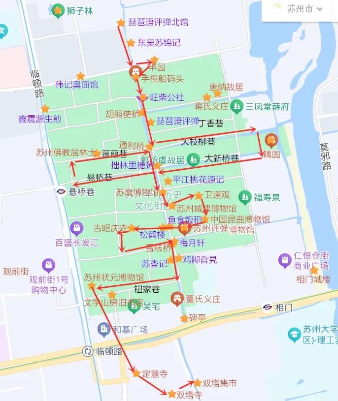 琵琶语评弹北馆→半园→柴旺公社→胡厢使桥→通利桥→大枝柳巷→耦园→大新桥巷→悬桥巷→苏州佛教林居士→菉葭巷→苏扇博物馆→苏州城建博物馆→卫道观→中国昆曲博物馆→评弹博物馆→古昭庆寺→雪糕桥→鸡脚旮旯→钮家巷→苏州状元博物馆