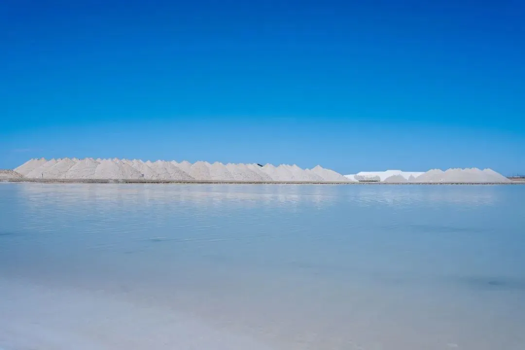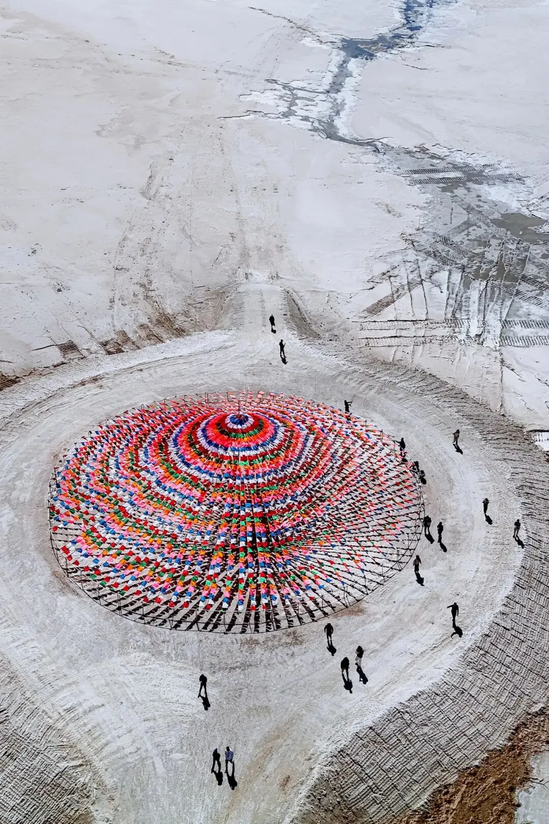 站在盐湖边,远处的天空与白色的湖面几乎融为一体。俯瞰盐滩小道,泥土的褐红色和白色盐湖相映成趣,巨大的经幡把祝福具象化了。