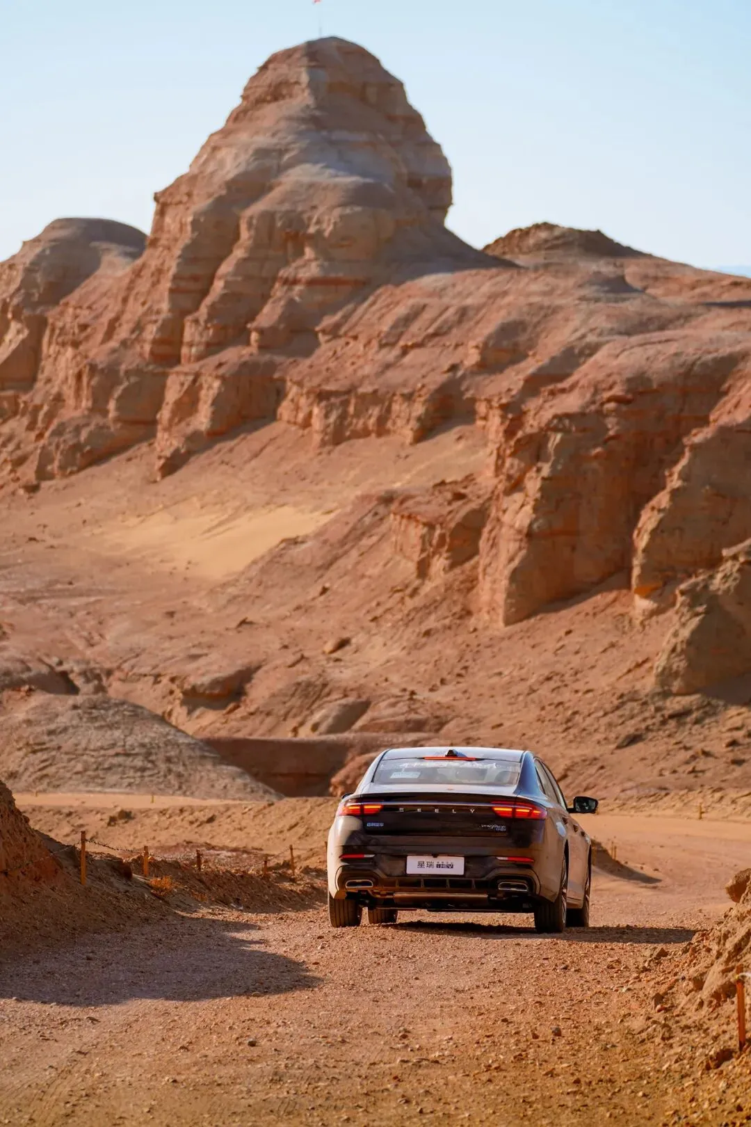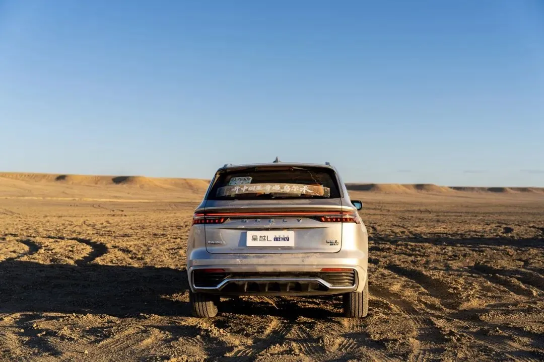 从魔鬼城出发,沿戈壁公路行驶,路程不远。此刻换驾月银色星越L i-HEV智擎混动,这台混动SUV也是搭载1.5TD混动专用发动机与DHT变速器,系统综合功率达230千瓦。