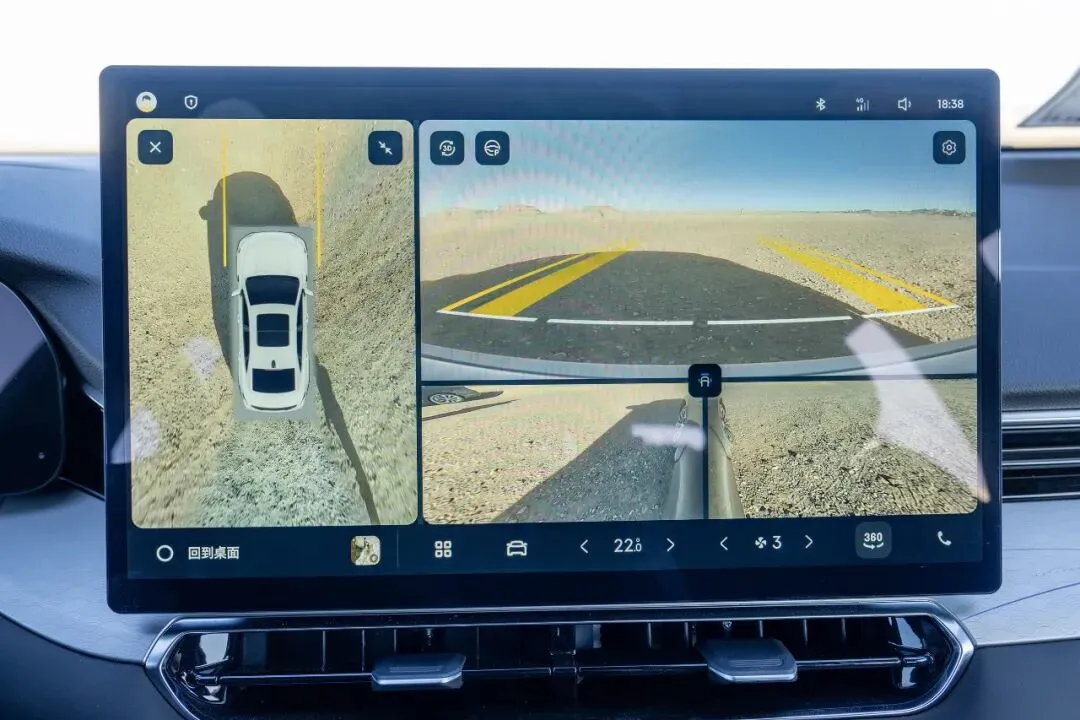 戈壁碎石路上,540度透明底盘发挥了重要作用,车身底部的路面情况清晰地显示在中控大屏上,配合前后左右四个方向的广角摄像头,对车底状况一目了然,有效避免托底或刮蹭。