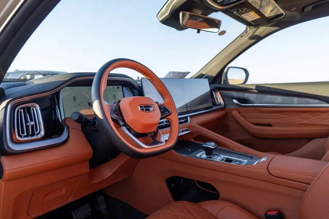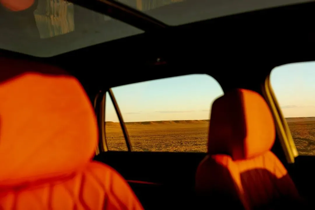 碧蓝的湖水平静得像一面镜子,倒映着流云与落日。星越L i-HEV的雅丹橙主题内饰在夕阳余晖映照下与窗外的湖光天色交相辉映。