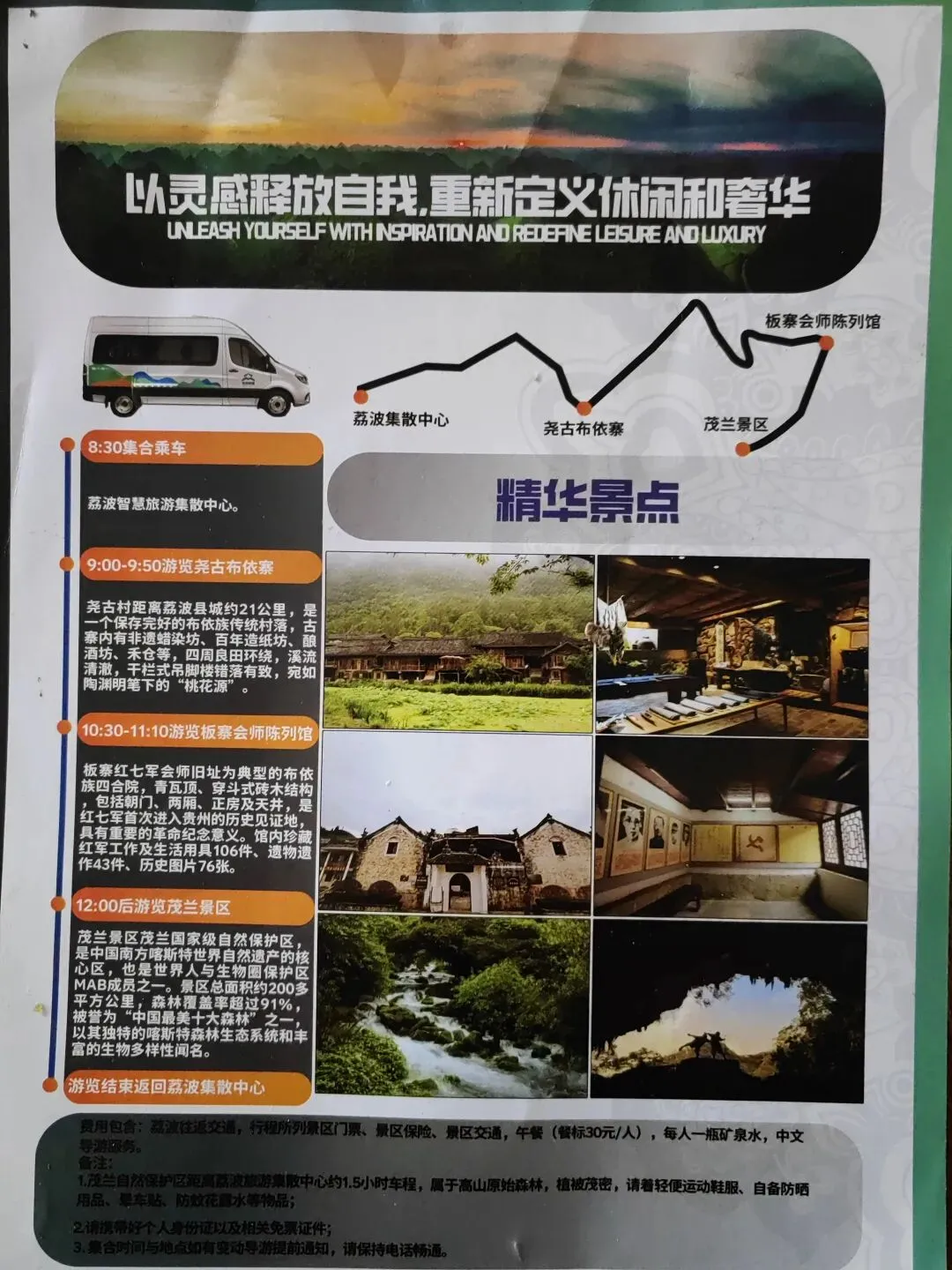 小众宝藏景点之:贵州荔波茂兰喀斯特景区游玩全攻略|原始森林·布依古寨·亲子露营徒步深度游想避开人潮拥挤,解锁荔波原生态喀斯特秘境?茂兰喀斯特国家级自然保护区绝对是宝藏选择!这里是世界自然遗产、中国最美十大森林之一,集原始森林、峡谷瀑布、天然溶洞、布依古寨、红色旧址于一体,徒步洗肺、亲水嬉玩、山野露营全覆盖,路况平缓、老少皆宜,全程实地实测干货攻略如下。 一、景区基础信息 - 地址:贵州省黔南州荔波县茂兰镇 - 核心优势:亿年喀斯特原始森林、负氧离子爆棚、小众原生态无商业化、山水溶洞古寨一站式、徒步露营亲子友好 - 开放时间:08:00-18:00(17:30停止入园,景区内无夜间照明,非露营区禁止逗留) - 咨询电话:0854-3615044 - 景区等级:国家AAAA级旅游景区、世界生物圈保护区 二、怎么去(交通全指南,实地实测) 1. 高铁+接驳(首选) - 贵阳北→荔波站(贵南高铁):约1.5小时,二等座120-150元 - 荔波站→茂兰景区:- 拼车/直通车:40元/人,车程约50分钟,直达景区大门 - 包车:160-200元/车,适合家庭、多人出行,可直达各景点 - 备注:景区无官方免费接驳车,非自驾务必提前预约车辆 2. 自驾(最推荐,自由便捷) - 导航:荔波茂兰喀斯特景区游客中心 - 路线:贵阳→银百高速→麻驾高速→茂兰镇,全程约3小时 - 荔波县城→茂兰:22公里,盘山公路,车程约50分钟 - 停车:景区大门停车场10元/天,五眼桥、尧古寨等点位可免费停车 - 提示:景区内景点分散,全程自驾更方便,无公共交通往返各点位 3. 公共交通(备选,不便) - 贵阳金阳客车站→荔波县城:约2.5小时,票价85元/人 - 荔波县城→茂兰:城乡中巴车20元/人,1小时一班,末班车16:00,仅到茂兰镇,需步行/打车到景区 4. 联游接驳 - 荔波小七孔→茂兰:包车/拼车60元/车,车程45分钟 - 联游推荐:搭配小七孔、瑶山古寨,打造3天2夜荔波全域环线,拒绝长途奔波 三、怎么预约(门票+入园全流程,2026最新实地) 1. 票务规则 - 景区大门票:50元/人(全年无淡旺季,一票通玩核心景点) - 环保车:无官方统一环保车,景点间靠自驾/包车/徒步 - 溶洞门票:金狮洞单独收费30元/人,其余未开发溶洞禁止私自进入 - 优惠政策:学生、60-69岁老人凭证半价;1.2米以下儿童、70岁以上老人、现役军人、残疾人凭证免票 2. 预约方式 - 线上:荔波文旅公众号、美团、携程实名预约,旺季(3-5月、9-11月)提前1天购票,刷身份证直接入园 - 线下:景区游客中心窗口、自助售票机购票,支持现金、移动支付 3. 入园须知 - 景区森林覆盖率高,溶洞、密林区域信号极弱,提前下载离线地图、保存导航路线 - 亲水、徒步路段青苔湿滑,必须穿防滑鞋;溶洞内恒温16℃左右,务必携带薄外套 - 景区内补给点少且物价偏高,建议提前备好饮用水、零食 - 全域禁止野外用火、采摘珍稀植物、捕捉野生动物,违者罚款 四、性价比住宿推荐(实地亲测) 1. 五眼桥民宿(景区核心,步行景点) - 五眼桥布依农家乐:标间120-180元/晚,含早餐,紧邻青龙潭、螃蟹沟,方便早起徒步 - 茂兰森林民宿:亲子房160-220元/晚,可代订向导、露营装备,提供本地农家餐 - 优势:出门即景区,省去往返车程,适合徒步、露营游客 2. 荔波县城酒店(舒适便利,性价比高) - 荔波城区商务酒店:140-200元/晚,免费停车、餐饮齐全,配套完善 - 优势:选择多、物价低,吃饭购物方便,次日前往小七孔更便捷 3. 景区露营(特色山野体验,实地合规点位) - 露营点位:五眼桥露营基地、青龙潭沙滩露营区(景区唯一合规露营点,禁止野外私自扎营) - 费用:- 帐篷租赁:120元/顶(含双人帐篷、防潮垫、睡袋,全套基础装备) - 自带装备:场地费30元/人,提供公共卫生间、水源、照明、简易洗漱台 - 烧烤:烤架租赁80元/套,可自带食材,营地提供炭火售卖 五、必游景点全介绍(实地游玩体验) 1. 青龙潭(核心必玩) 茂兰标志性水上森林,“水在石上淌,树在水中长”,步道平缓全程无陡坡,溪水清澈见底,夏季亲水踩水超舒适,拍照氛围感拉满。 2. 螃蟹沟 原生态浅滩嬉玩区,溪流缓慢、水质清澈,无安全隐患,亲子捞鱼、嬉水绝佳,周边林荫密布,避暑好去处。 3. 拉滩瀑布 隐匿于密林之中的天然瀑布,水流潺潺、水雾清凉,是徒步途中的休憩打卡点,无需爬坡,轻松抵达。 4. 金狮洞 景区唯一开发成熟的溶洞,洞内钟乳石形态各异,灯光柔和,步道平稳,地质科普、避暑探洞首选,需单独购票。 5. 尧古布依寨 原生态传统布依古寨,吊脚楼依山而建,保留古法造纸、布依扎染非遗技艺,无商业套路,可沉浸式体验民俗风情。 6. 板寨会师陈列馆 红色研学必打卡,免费开放,陈列红七军会师历史文物、文献,全程平缓无爬坡,适合亲子、家庭学习红色文化。 7. 黎明关 黔桂交界古关隘,轻度徒步路线,全程缓坡约1.5小时,登顶俯瞰喀斯特峰林全景,徒步爱好者首选,老人儿童可选择性游玩。 六、私人深度路线(含露营,实地不累不赶) 方案A:1日精华线(亲子/老人专属,6-7小时) 08:30 荔波县城/民宿出发→自驾抵达茂兰景区 09:00-10:30 青龙潭水上森林徒步、亲水打卡 10:40-11:40 螃蟹沟浅滩嬉水、亲子休闲 12:00-13:00 五眼桥农家乐午餐,品尝本地土鸡、野菜 13:30-14:30 拉滩瀑布打卡、林间休憩 15:00-16:00 尧古布依寨闲逛,体验非遗民俗 16:30 返程 方案B:2天1夜·露营深度线(主推,沉浸式山野) Day1 古寨+森林+露营,慢玩不赶路 08:30 出发前往茂兰景区 09:30-11:00 板寨会师陈列馆红色研学 11:10-12:00 尧古布依寨逛古寨