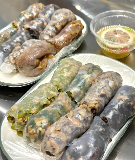 第三美食:越南卷粉侨港那边的卷粉最正宗。米浆现蒸成薄薄的粉皮,包裹着木耳、肉末、香菇碎,卷成小卷,再淋上特制的黄皮酱和芝麻油。口感爽滑,馅料鲜香。一定要配一杯冰咖啡或者清补凉,一咸一甜,一热一冷,口感层次丰富。人均10块钱能吃6条,便宜又好吃。