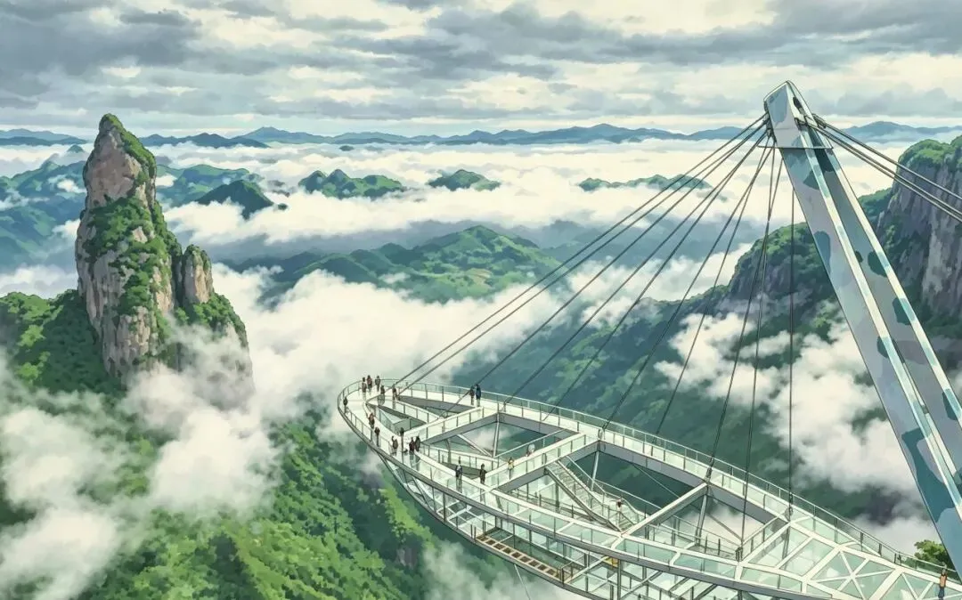 美景亮点:外交部推荐的“空中玉如意”,S型玻璃悬桥横跨百米峡谷,钢结构如祥云缠绕,晴天通透、云雾中似悬浮仙境。