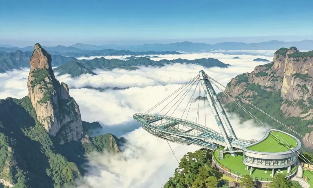 美景亮点:215米长高空悬索桥,寓意“圆梦成真”,漫步其上,群山环抱、云雾拂面,如穿行梦境 。