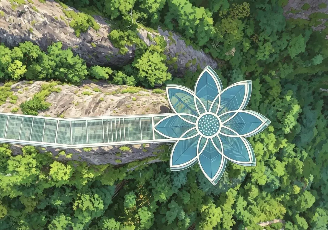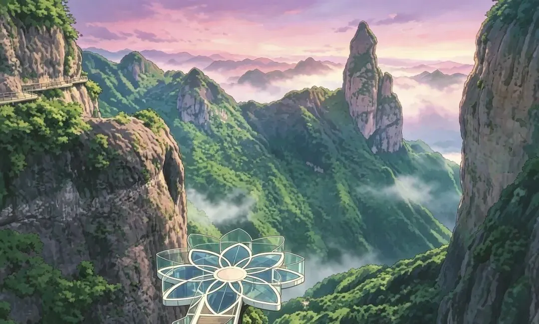 美景亮点:八瓣莲花状玻璃平台,嵌于悬崖之巅,与观音峰遥相呼应,航拍如仙山雪莲,是治愈系打卡点 。