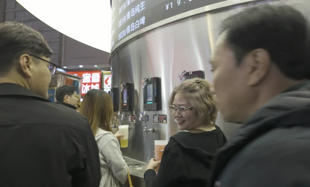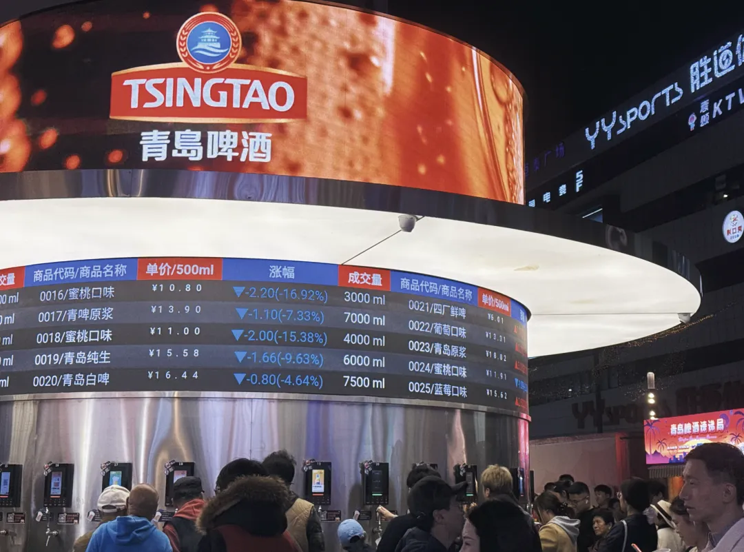 核心活力区叫做“恣儿街”——“恣儿”在青岛话里是“舒服、开心”的意思。这里的顶流应该是青交所——青岛啤酒交易所。相当有意思,酒的单价随着销量涨跌,自助取个杯子扫码打酒……