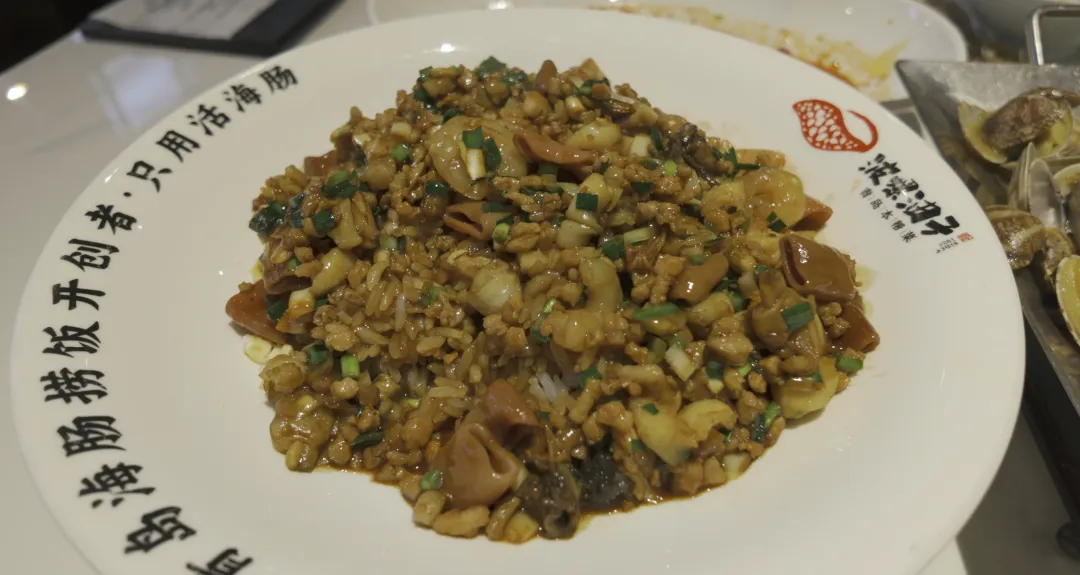 波螺油子餐厅是点评上的必吃榜,大名鼎鼎的海肠捞饭的开创者,那肯定是要吃的。一份至尊海肠捞饭98元,里面有滑嫩的海肠,还有各种海鲜的碎料,还有灵魂的韭菜,酱汁应该是肉酱汁,和米饭拌在一起,总之就是很馋,好吃!另外点的几个菜也不踩雷,必吃榜还是有道理的。