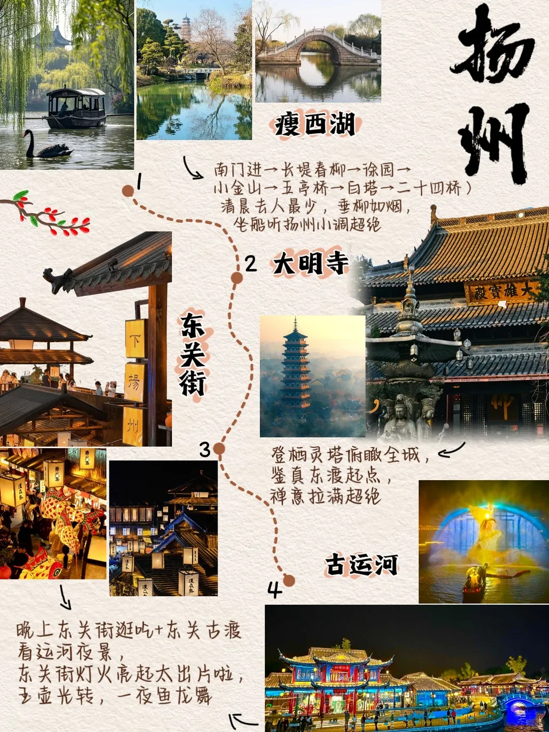 Day2️⃣诗意湖光| 动线:瘦西湖→大明寺→东关街+夜游古运河 📍瘦西湖(南门进→长堤春柳→徐园→小金山→五亭桥→白塔→二十四桥) 清晨去人最少,垂柳如烟,坐船听扬州小调超绝,若是月圆之夜来这,便可看到到杜牧笔下的“二十四桥明月夜” 📍大明寺:登栖灵塔俯瞰全城,鉴真东渡起点,禅意拉满 📍晚上:东关街逛吃+东关古渡看运河夜景,灯火亮起太出片啦,真有“玉壶光转,一夜鱼龙舞”那味了