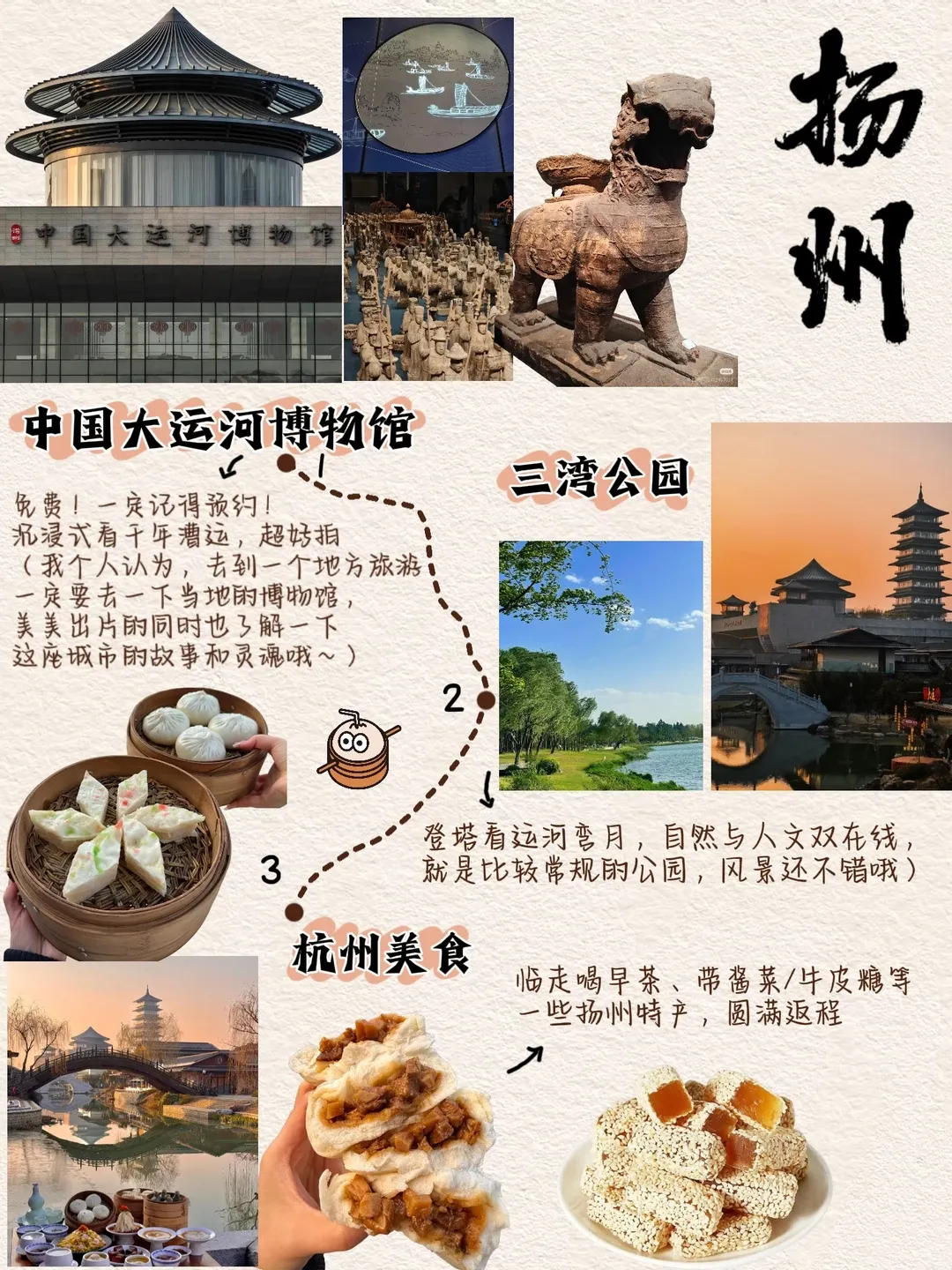 Day3️⃣运河史诗| 动线:大运河博物馆→三湾公园→收尾美食 📍中国大运河博物馆:免费!一定记得预约!沉浸式看千年漕运,超好拍 (我认为,去到一个地方旅游一定要去一下当地的博物馆,美美出片的同时也了解一下这座城市的故事和灵魂哦~) 📍运河三湾:登塔看运河弯月,自然与人文双在线,就是比较常规的公园,风景还不错哦 🍽临走喝早茶、带酱菜/牛皮糖等一些扬州特产,圆满返程