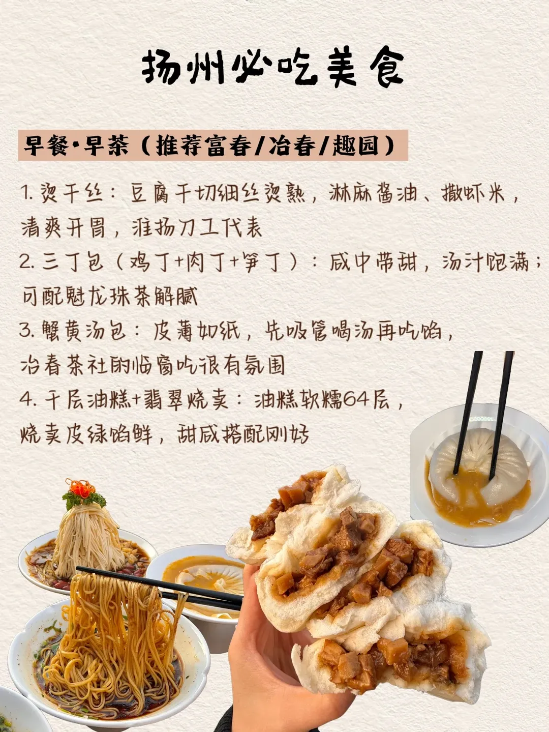 🍜必吃美食 ⭕️早餐·早茶(推荐富春/冶春/趣园) 1. 烫干丝 2. 三丁包(鸡丁+肉丁+笋丁) 3. 蟹黄汤包 4. 千层油糕+翡翠烧卖