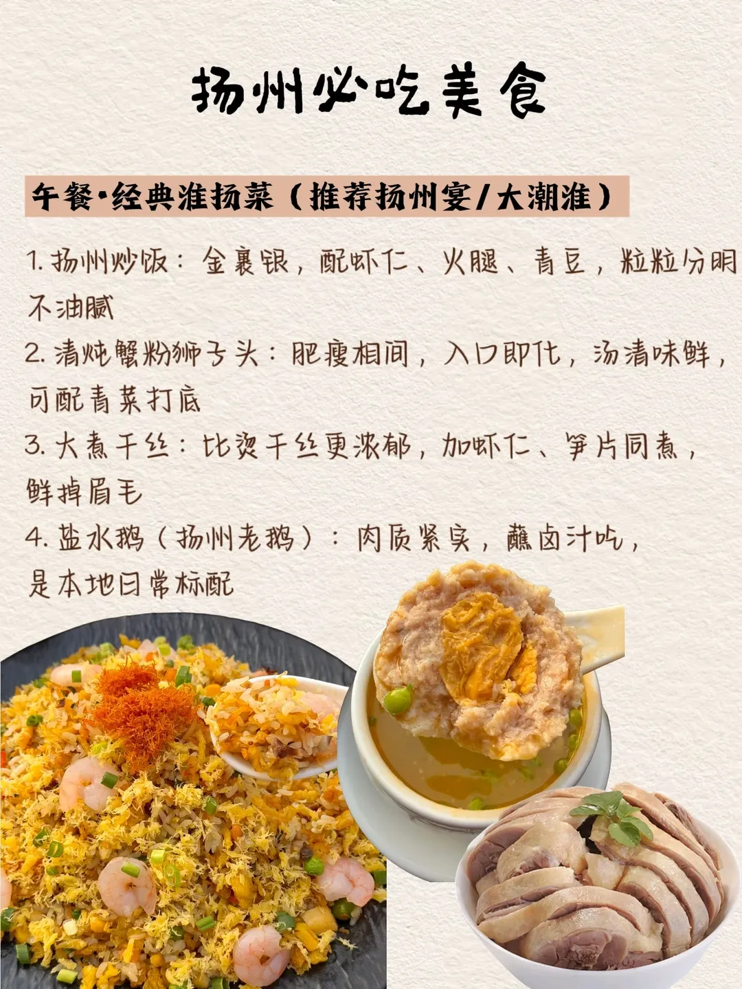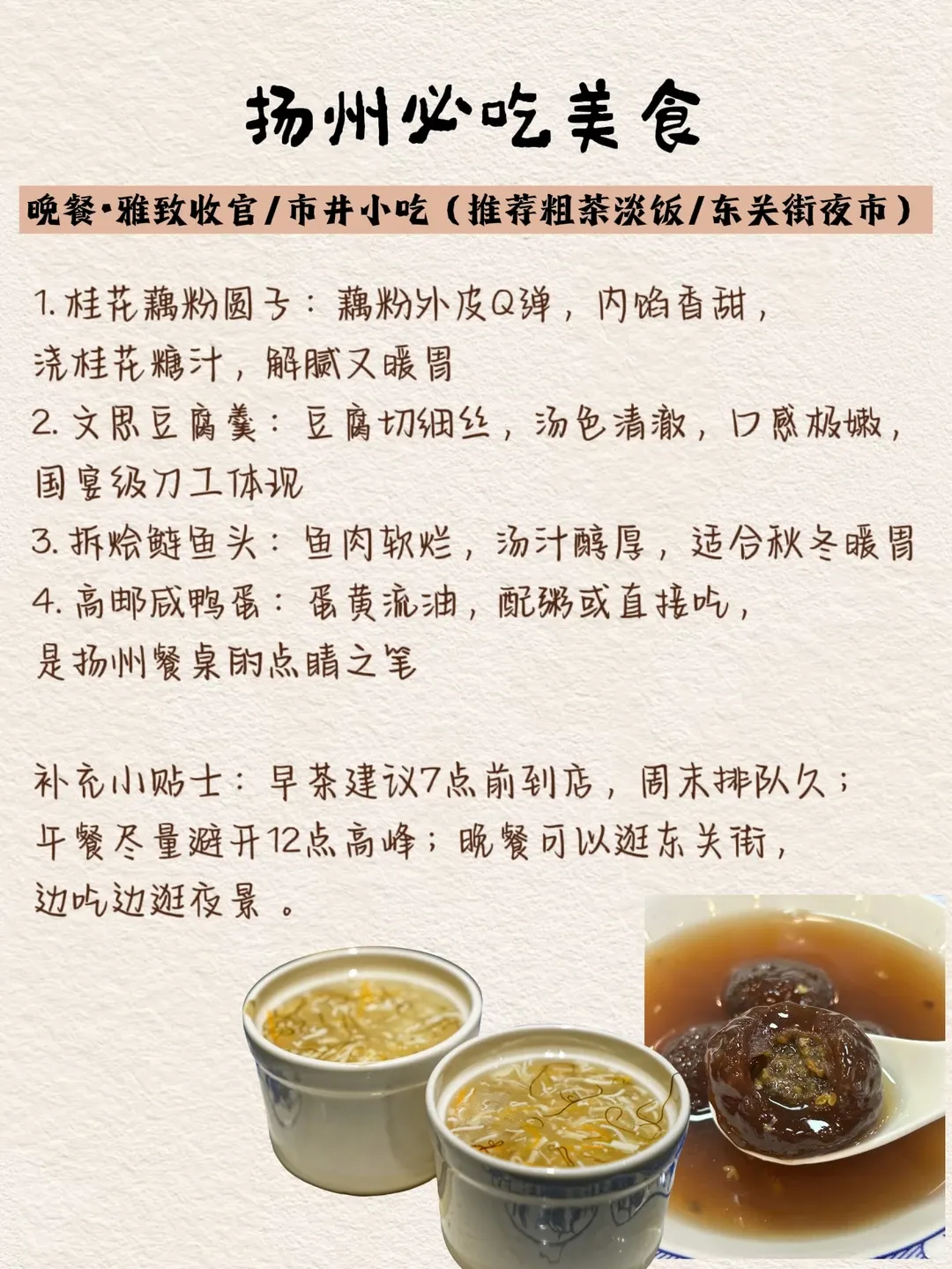 ⭕️晚餐·雅致收官/市井小吃(推荐粗茶淡饭/东关街夜市) 1.桂花藕粉圆子 2.文思豆腐羹 3.拆烩鲢鱼头 4.高邮咸鸭蛋 早茶建议7点前到店,周末排队久;午餐尽量避开12点高峰;晚餐可以逛东关街,边吃边逛夜景 。 💡扬州小Tips 1. 景点尽量提前预约,大运河博物馆约满难进 2. 穿浅色系/新中式衣服,拍照巨有江南感 3. 三月早晚微凉,带件薄外套