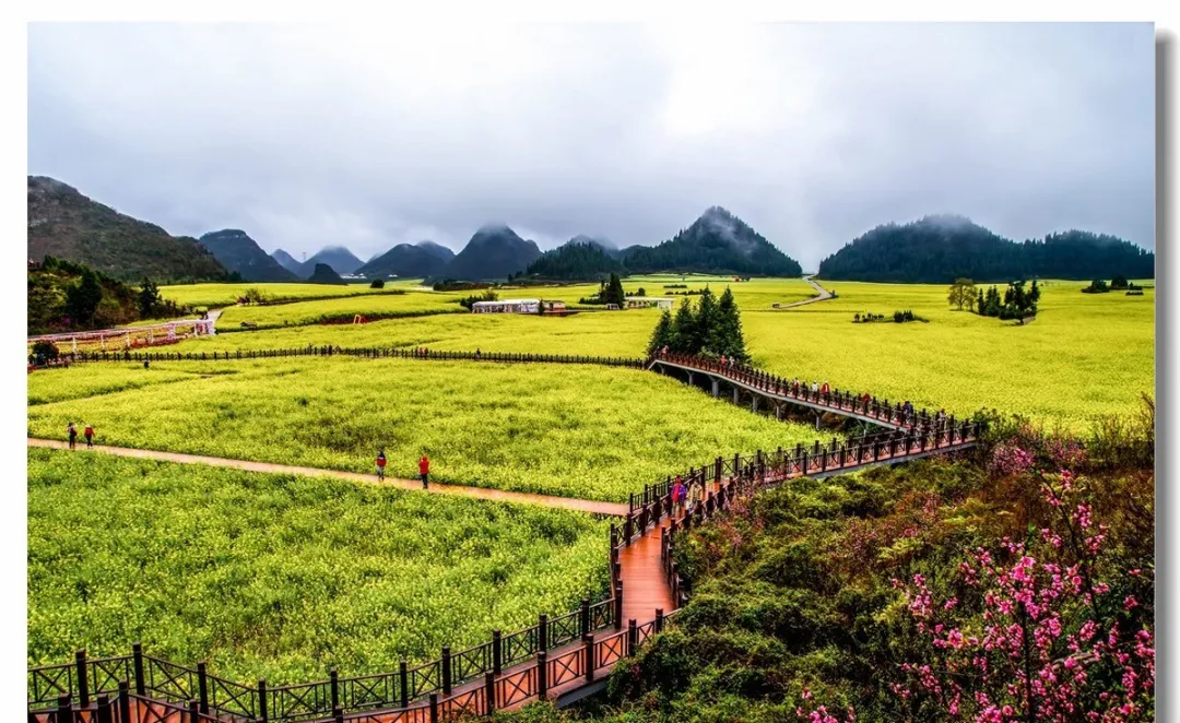 罗平这地方说实话我一开始是不太想去的,因为觉得不就是油菜花吗,皖南也有啊,但真去了才发现完全不一样,罗平的油菜花是一望无际的那种,不是梯田式的层次,是平铺开来的辽阔,站在金鸡峰上往下看,你会觉得整个世界都是金黄色的,那种视觉冲击特别强烈。