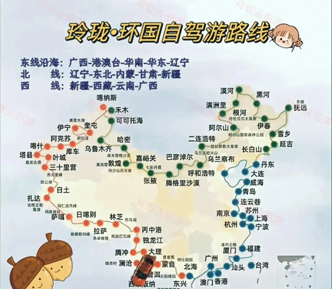 从辽宁丹东出发,沿着中朝边境一路向北,经过吉林延边、黑龙江黑河、漠河,然后折向西进入内蒙古,沿着中蒙边境线穿过呼伦贝尔草原、二连浩特、阿拉善,进入新疆后沿着中哈边境、中吉边境、中塔边境一路向西,经过喀什进入西藏阿里地区,沿着中印边境、中尼边境进入云南,然后沿着中缅边境、中老边境、中越边境一路向东,经过广西沿海回到东部沿海,最后从福建或浙江结束行程。