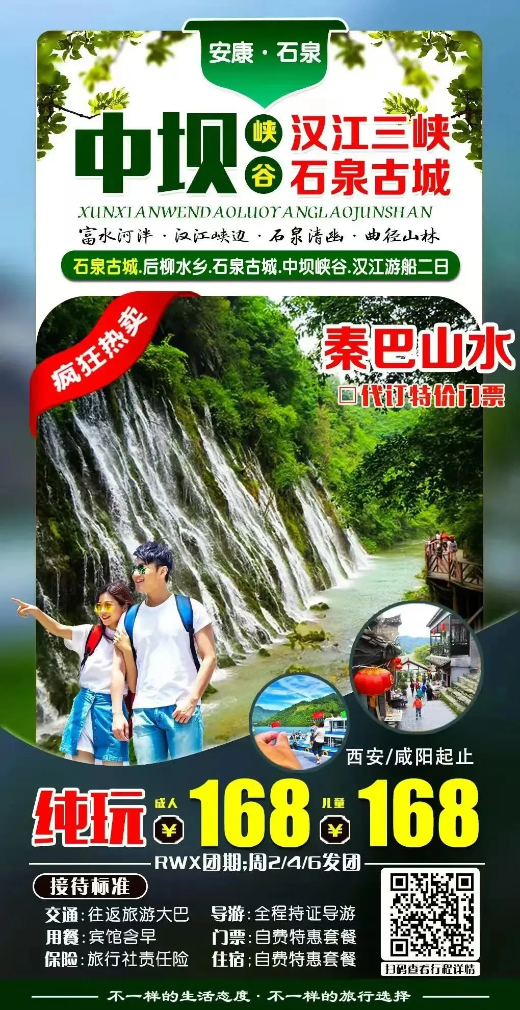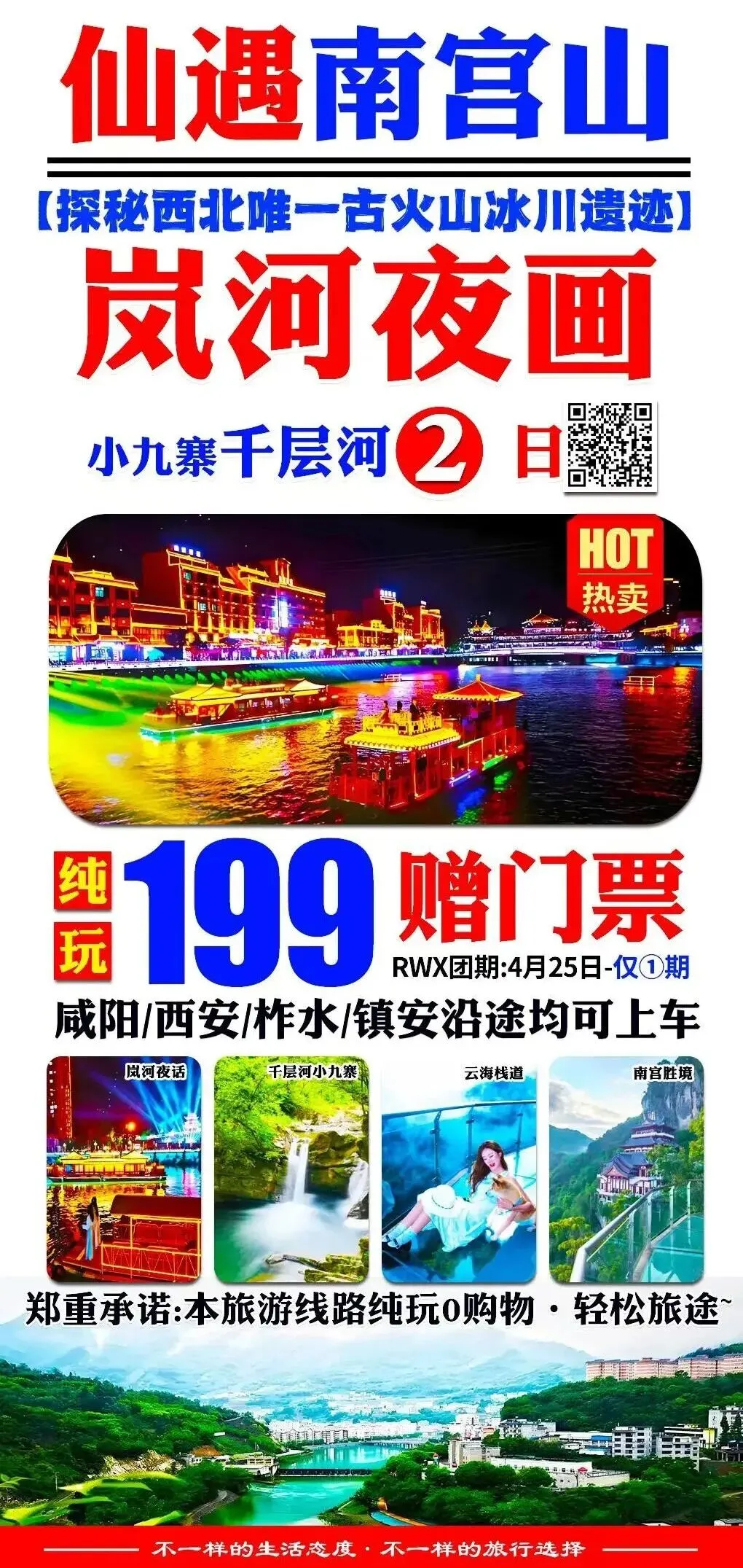 🔆好消息‼千人游南宫山来了~ <秦巴明珠💓硒望岚皋> 纯玩¥199 ‼赠送景区门票‼ 团期4月25日-仅此①期; 沿途:咸阳/西安/柞水/镇安可上下; 【政策补贴💓文旅支持】 ‼感谢安康文旅的大力支持‼ ‼感谢岚皋文旅的大力支持‼ ✅探秘西北唯一古火山冰川遗迹【南宫山】 ✅走进秦巴山处女地小九寨【千层河】 ✅感受小城夜景霓虹闪耀【岚河夜画游船】 🅾南宫山.岚河夜画.千层河大巴2日游 【‼赠送景区门票‼】 🅾活动价¥199 ✅大小同价 ✅含往返车费+赠送¥80南宫山/¥60千层河门票; 备注说明:赠送门票证件无优惠无退费; ✅订驼铃/千古情/丝路/大秦; |